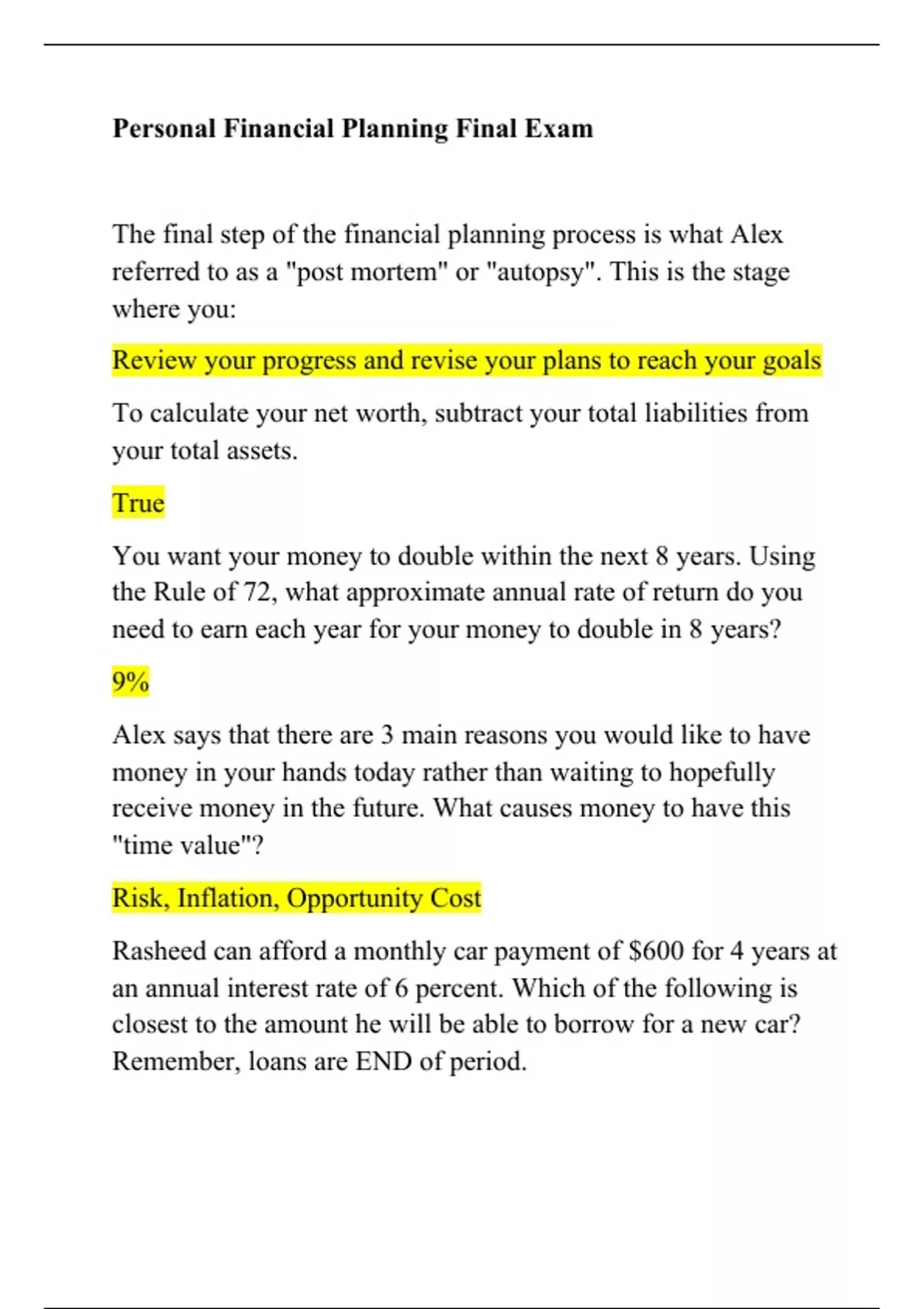 personal financial planning final exam