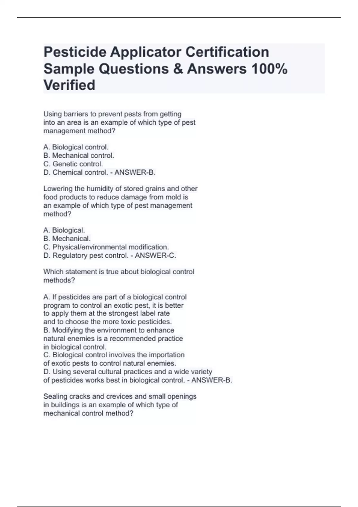 Pesticide Applicator Certification Sample Questions & Answers 100% VerifiedPesticide Applicator Certification Sample Questions & Answers 100% VerifiedPesticide Applicator Certification Sample Questions & Answers 100% VerifiedPesticide Applicator Certification Sample Questions & Answers 100% Verified Using barriers to prevent pests from getting into an area is an example of which type of pest management method? A. Biological control. B. Mechanical control. C. Genetic control. D. Chemical control. - ANSWER-B. Lowering the humidity of stored grains and other food products to reduce damage from mold is