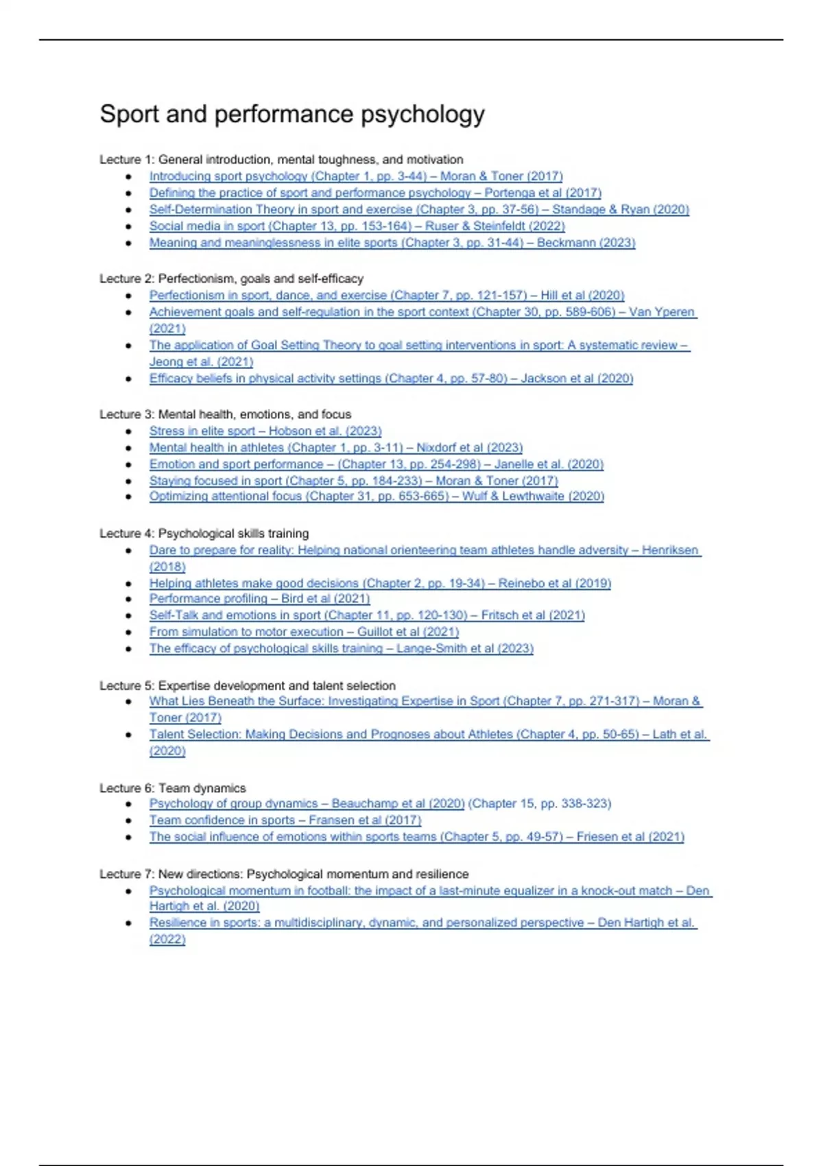 In this course, the required literature consisted of a series of chapters and articles (27 in total) that provide an overview of key theories, concepts, and findings within the discipline of sport and performance psychology, as well as a critical perspective that examines and challenges these core foundations. The literature covers key theories, models, and research findings affecting both participation and performance in sport, including topics such as motivation and enjoyment, goal setting, mental well-being, psychological skills training, expertise, team dynamics, and resilience. The required articles: Lecture 1: General introduction, mental toughness, and motivation  Introducing sport psychology (Chapter 1, pp. 3-44) – Moran & Toner (2017)  Defining the practice of sport and performance psychology – Portenga et al (2017)  Self Determination Theory in sport and exercise (Chapter 3, pp. 37-56) – Standage & Ryan (2020) ‐  Social media in sport (Chapter 13, pp. 153-164) – Ruser & Steinfeldt (2022)  Meaning and meaninglessness in elite sports (Chapter 3, pp. 31-44) – Beckmann (2023) Lecture 2: Perfectionism, goals and self-efficacy  Perfectionism in sport, dance, and exercise (Chapter 7, pp. 121-157) – Hill et al (2020)  Achievement goals and self-regulation in the sport context (Chapter 30, pp. 589-606) – Van Yperen (2021)  The application of Goal Setting Theory to goal setting interventions in sport: A systematic review – Jeong et al. (2021)  Efficacy beliefs in physical activity settings (Chapter 4, pp. 57-80) – Jackson et al (2020) Lecture 3: Mental health, emotions, and focus  Stress in elite sport – Hobson et al. (2023)  Mental health in athletes (Chapter 1, pp. 3-11) – Nixdorf et al (2023)  Emotion and sport performance – (Chapter 13, pp. 254-298) – Janelle et al. (2020)  Staying focused in sport (Chapter 5, pp. 184-233) – Moran & Toner (2017)  Optimizing attentional focus (Chapter 31, pp. 653-665) – Wulf & Lewthwaite (2020) Lecture 4: Psychological skills training  Dare to prepare for reality: Helping national orienteering team athletes handle adversity – Henriksen (2018)  Helping athletes make good decisions (Chapter 2, pp. 19-34) – Reinebo et al (2019)  Performance profiling – Bird et al (2021)  Self-Talk and emotions in sport (Chapter 11, pp. 120-130) – Fritsch et al (2021)  From simulation to motor execution – Guillot et al (2021)  The efficacy of psychological skills training – Lange-Smith et al (2023) Lecture 5: Expertise development and talent selection  What Lies Beneath the Surface: Investigating Expertise in Sport (Chapter 7, pp. 271-317) – Moran & Toner (2017)  Talent Selection: Making Decisions and Prognoses about Athletes (Chapter 4, pp. 50-65) – Lath et al. (2020) Sport and Performance Psychology (PSB3E-OP01) Page 3 Lecture 6: Team dynamics  Psychology of group dynamics – Beauchamp et al (2020)  Team confidence in sports – Fransen et al (2017)  The social influence of emotions within sports teams (Chapter 5, pp. 49-57) – Friesen et al (2021) Lecture 7: New directions: Psychological momentum and resilience  Psychological momentum in football: the impact of a last-minute equalizer in a knock-out match – Den Hartigh et al. (2020)  Resilience in sports: a multidisciplinary, dynamic, and personalized perspective – Den Hartigh et al. (2022)
