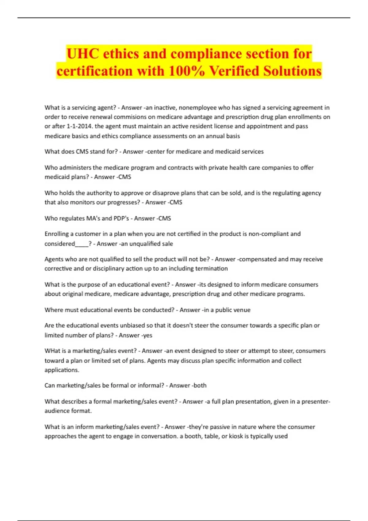 UHC ethics and compliance section for certification with 100% Verified Solutions What is a servicing agent? - Answer -an inactive, nonemployee who has signed a servicing agreement in order to receive renewal commisions on medicare advantage and prescription drug plan enrollments on or after 1-1-2014. the agent must maintain an active resident license and appointment and pass medicare basics and ethics compliance assessments on an annual basis What does CMS stand for? - Answer -center for medicare and medicaid services Who administers the medicare program and contracts with private health care companies to offer medicaid plans? - Answer -CMS Who holds the authority to approve or disaprove plans that can be sold, and is the regulating agency that also monitors our progresses? - Answer -CMS Who regulates MA's and PDP's - Answer -CMS Enrolling a customer in a plan when you are not certified in the product is non-compliant and considered____? - Answer -an unqualified sale Agents who are not qualified to sell the product will not be? - Answer -compensated and may receive corrective and or disciplinary action up to an including termination What is the purpose of an educational event? - Answer -its designed to inform medicare consumers about original medicare, medicare advantage, prescription drug and other medicare programs. Where must educational events be conducted? - Answer -in a public venue Are the educational events unbiased so that it doesn't steer the consumer towards a specific plan or limited number of plans? - Answer -yes WHat is a marketing/sales event? - Answer -an event designed to steer or attempt to steer, consumers toward a plan or limited set of plans. Agents may discuss plan specific information and collect applications. Can marketing/sales be formal or informal? - Answer -both What describes a formal marketing/sales event? - Answer -a full plan presentation, given in a presenteraudience format. What is an inform marketing/sales event? - Answer -they're passive in nature where the consumer approaches the agent to engage in conversation. a booth, table, or kiosk is typically usedWhat are marketing appointments? - Answer -They're commonly referred to as "in home, face to face, or one on one appointment" and typically take place in the consumers home. What other places can marketing appointments happen? - Answer -coffee shop, or even over the phone because marketing appointments are not formal and informal marketing sales events, they're not reported to who? - Answer -UHC or CMS. instead, agents must obtain a completed scope of appointment prior to conducting the appointment. To report events, what should agents use? - Answer -an event request form to ensure that events are in UHC's event reporting application no less th
