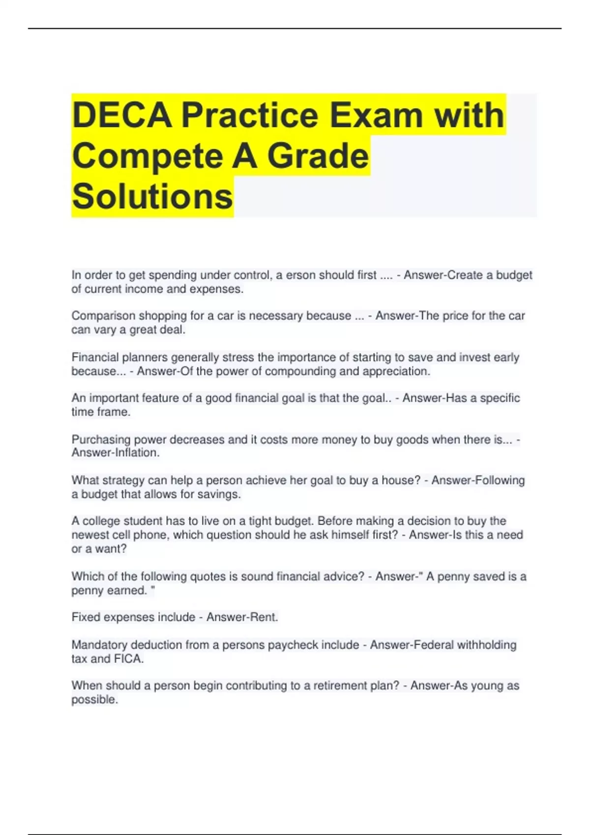 DECA Practice Exam with Compete A Grade Solutions order to get spending under control, a erson should first .... - Answer-Create a budget of current income and expenses. Comparison shopping for a car is necessary because ... - Answer-The price for the car can vary a great deal. Financial planners generally stress the importance of starting to save and invest early because... - Answer-Of the power of compounding and appreciation. An important feature of a good financial goal is that the goal.. - Answer-Has a specific time frame. Purchasing power decreases and it costs more money to buy goods when there is... - Answer-Inflation. What strategy can help a person achieve her goal to buy a house? - Answer-Following a budget that allows for savings. A college student has to live on a tight budget. Before making a decision to buy the newest cell phone, which question should he ask himself first? - Answer-Is this a need or a want? Which of the following quotes is sound financial advice? - Answer-" A penny saved is a penny earned. " Fixed expenses include - Answer-Rent. Mandatory deduction from a persons paycheck include - Answer-Federal withholding tax and FICA. When should a person begin contributing to a retirement plan? - Answer-As young as possible.