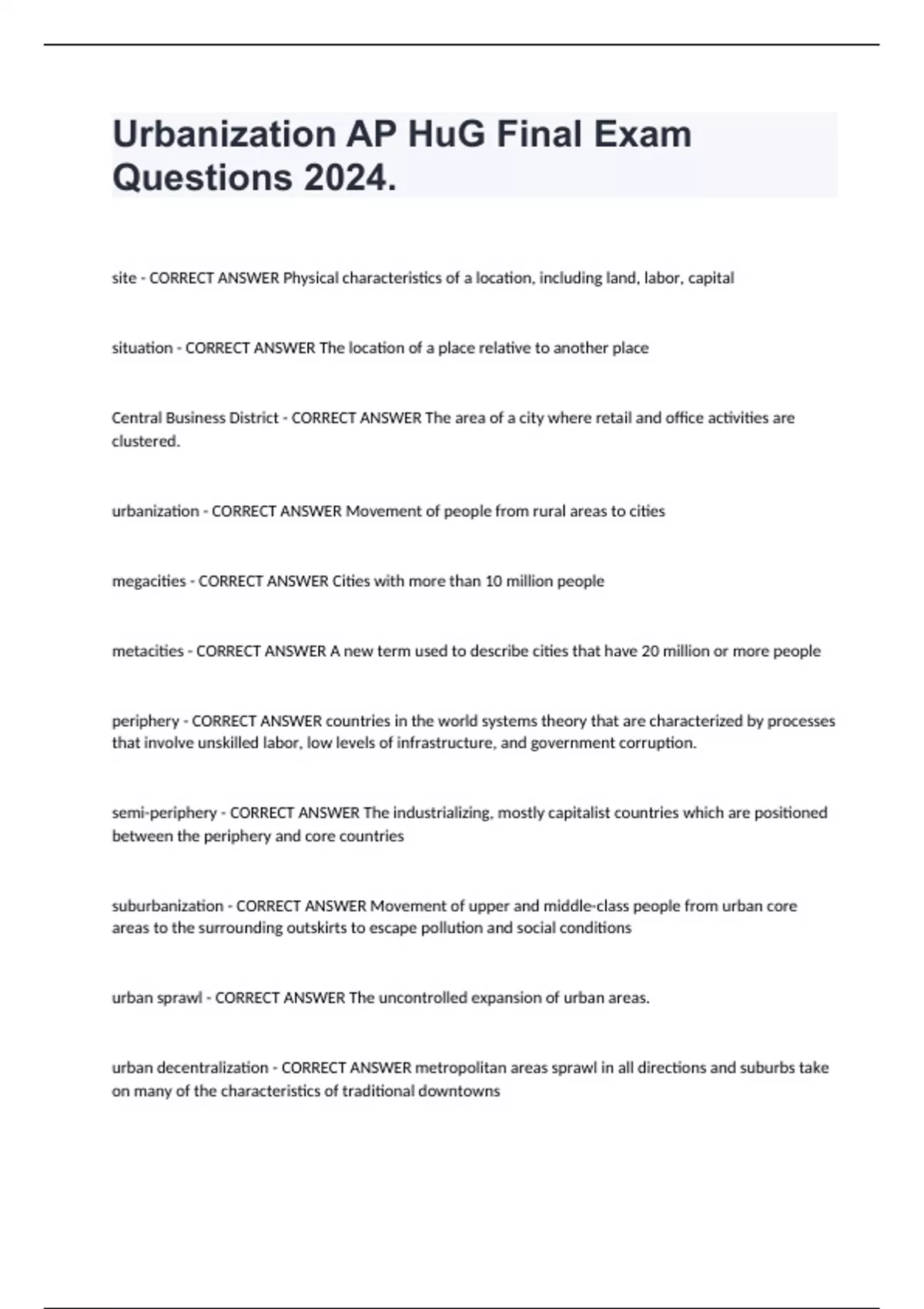 Urbanization AP HuG Final Exam Questions 2024. site - CORRECT ANSWER Physical characteristics of a location, including land, labor, capital situation - CORRECT ANSWER The location of a place relative to another place Central Business District - CORRECT ANSWER The area of a city where retail and office activities are clustered. urbanization - CORRECT ANSWER Movement of people from rural areas to cities megacities - CORRECT ANSWER Cities with more than 10 million people metacities - CORRECT ANSWER A new term used to describe cities that have 20 million or more people periphery - CORRECT ANSWER countries in the world systems theory that are characterized by processes that involve unskilled labor, low levels of infrastructure, and government corruption. semi-periphery - CORRECT ANSWER The industrializing, mostly capitalist countries which are positioned between the periphery and core countries suburbanization - CORRECT ANSWER Movement of upper and middle-class people from urban core areas to the surrounding outskirts to escape pollution and social conditions urban sprawl - CORRECT ANSWER The uncontrolled expansion of urban areas. urban decentralization - CORRECT ANSWER metropolitan areas sprawl in all directions and suburbs take on many of the characteristics of traditional downtowns