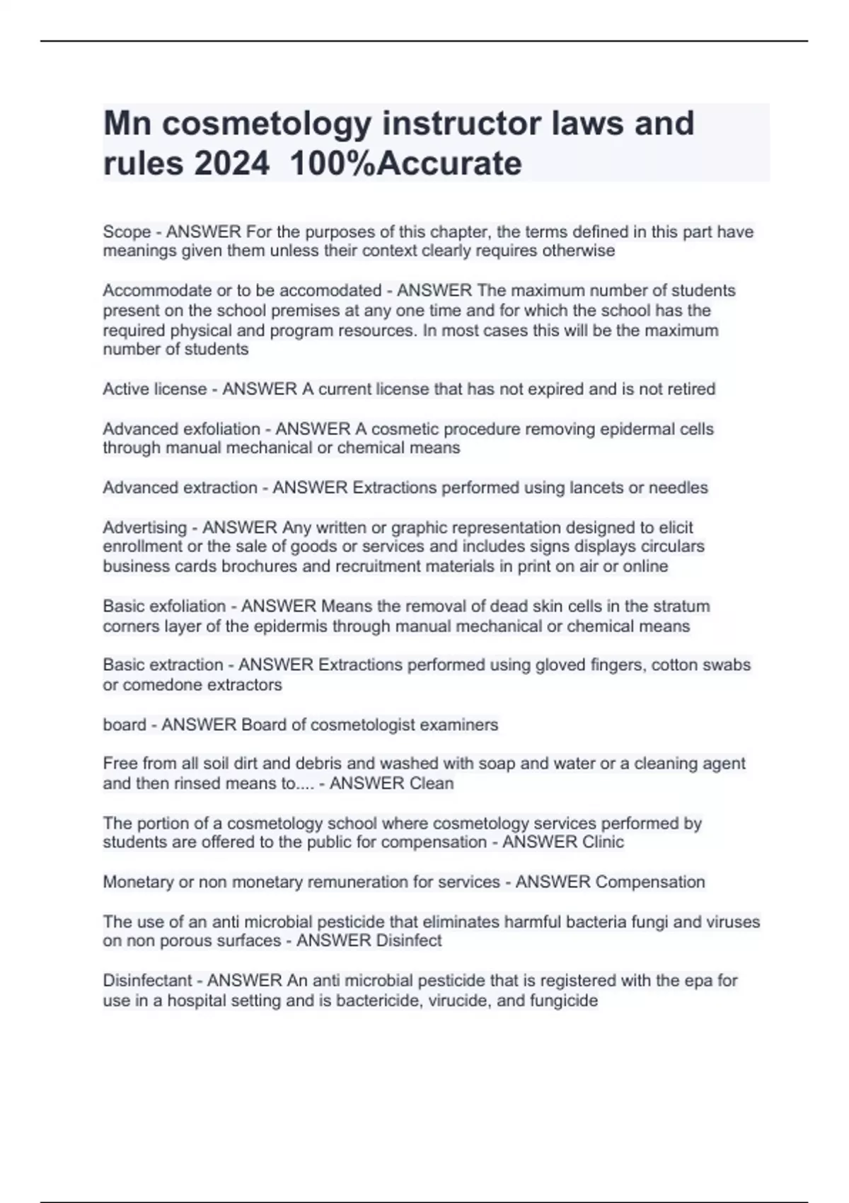 Mn cosmetology instructor laws and rules 2 Scope - ANSWER For the purposes of this chapter, the terms defined in this part have meanings given them unless their context clearly requires otherwise Accommodate or to be accomodated - ANSWER The maximum number of students present on the school premises at any one time and for which the school has the required physical and program resources. In most cases this will be the maximum number of students Active license - ANSWER A current license that has not expired and is not retired Advanced exfoliation - ANSWER A cosmetic procedure removing epidermal cells through manual mechanical or chemical means Advanced extraction - ANSWER Extractions performed using lancets or needles Advertising - ANSWER Any written or graphic representation designed to elicit enrollment or the sale of goods or services and includes signs displays circulars business cards brochures and recruitment materials in print on air or online Basic exfoliation - ANSWER Means the removal of dead skin cells in the stratum corners layer of the epidermis through manual mechanical or chemical means Basic extraction - ANSWER Extractions performed using gloved fingers, cotton swabs or comedone extractors board - ANSWER Board of cosmetologist examiners Free from all soil dirt and debris and washed with soap and water or a cleaning agent and then rinsed means to.... - ANSWER Clean The portion of a cosmetology school where cosmetology services performed by students are offered to the public for compensation - ANSWER Clinic Monetary or non monetary remuneration for services - ANSWER Compensation The use of an anti microbial pesticide that eliminates harmful bacteria fungi and viruses on non porous surfaces - ANSWER Disinfect Di024 100%Accurate