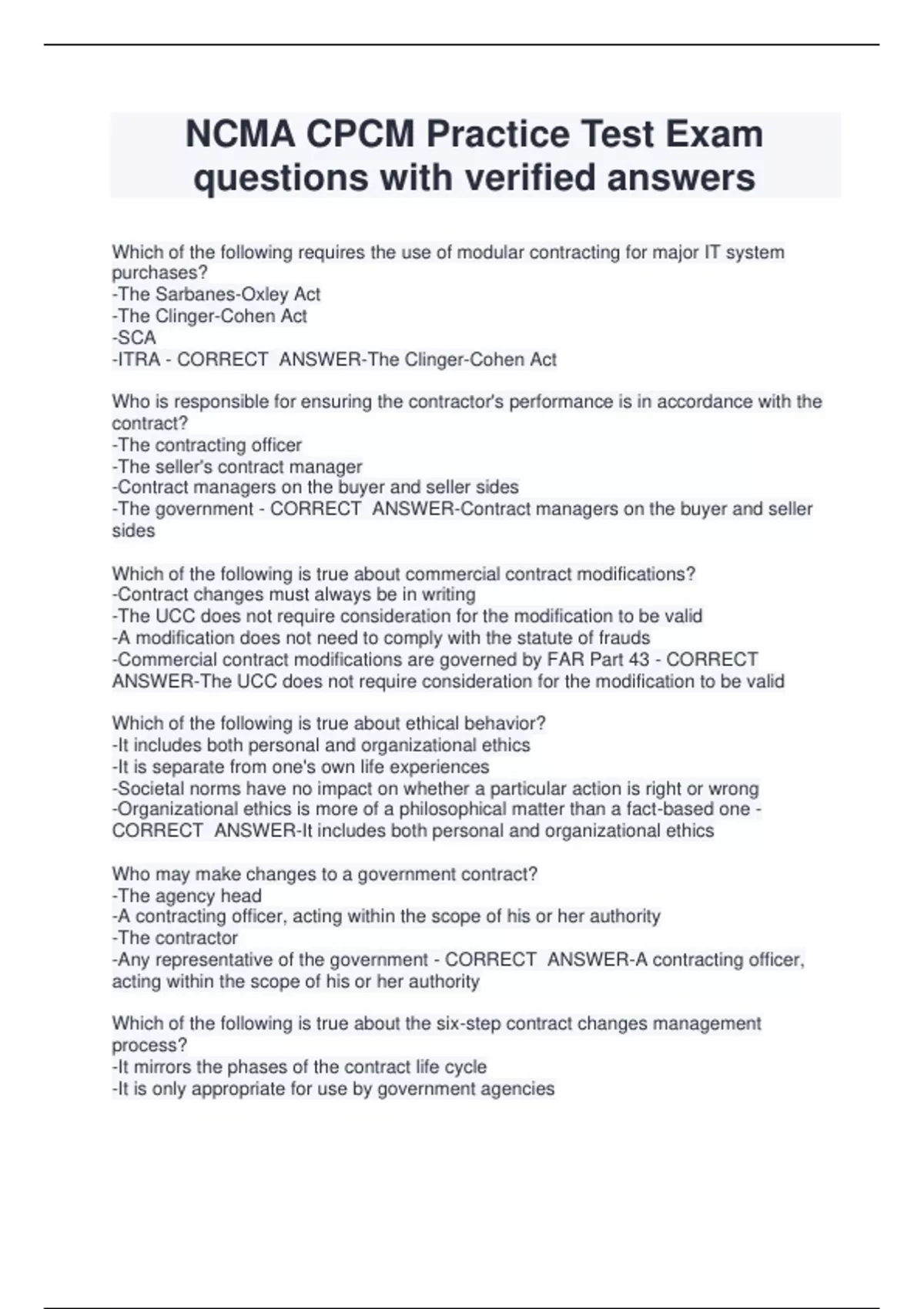 NCMA CPCM Practice Test Exam questions with verified answers Which of the following requires the use of modular contracting for major IT system purchases? -The Sarbanes-Oxley Act -The Clinger-Cohen Act -SCA -ITRA - CORRECT ANSWER-The Clinger-Cohen Act Who is responsible for ensuring the contractor's performance is in accordance with the contract? -The contracting officer -The seller's contract manager -Contract managers on the buyer and seller sides -The government - CORRECT ANSWER-Contract managers on the buyer and seller sides Which of the following is true about commercial contract modifications? -Contract changes must always be in writing -The UCC does not require consideration for the modification to be valid -A modification does not need to comply with the statute of frauds -Commercial contract modifications are governed by FAR Part 43 - CORRECT ANSWER-The UCC does not require consideration for the modification to be valid Which of the following is true about ethical behavior? -It includes both personal and organizational ethics -It is separate from one's own life experiences -Societal norms have no impact on whether a particular action is right or wrong -Organizational ethics is more of a philosophical matter than a fact-based one - CORRECT ANSWER-It includes both personal and organizational ethics Who may make changes to a government contract? -The agency head -A contracting officer, acting within the scope of his or her authority -The contractor -Any representative of the government - CORRECT ANSWER-A contracting officer, acting within the scope of his or her authority Which of the following is true about the six-step contract changes management process? -It mirrors the phases of the contract life cycle -It is only appropriate for use by government agencies -It will always result in on-time delivery or on-budget completion of the work -It begins with the award of a contract change - CORRECT ANSWER-It mirrors the phases of the contract life cycle Whose responsibility is effective contract administration? -The contracting officer -The buyer -The seller -Both the buyer and the seller - CORRECT ANSWER-Both the buyer and the seller Which of the following provides an authoritative, formalized, written set of guidelines that require certain actions and prohibit others? -Regulations -Ethics -Values -Morals - CORRECT ANSWER-Regulations Which of the following is not one of the three basic types of SOWs? -Performance -Functional -Specification -Design - CORRECT ANSWER-Specification Which of the following is not a required task of contract closeout? -Disposition of buyer-furnished property -Signing a formal notice of contract completion -Verifying payment of all contractor invoices -Providing feedback and rewards for superior performance - CORRECT ANSWERProviding feedback and rewards for superior performance Which of the following is real property? -Wood used in the construction of a building -Screws used to assemble a machine -A warehouse for the storage of equipment -A test unit modified to accomplish special-purpose test