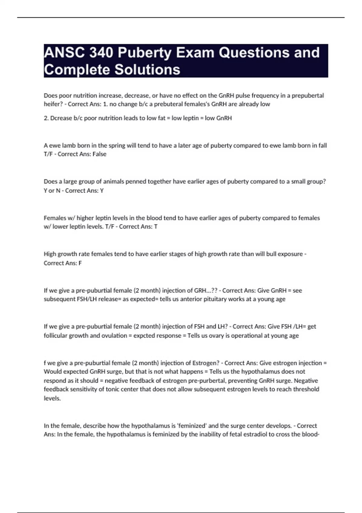 ANSC 340 Puberty Exam Questions and Complete Solutions