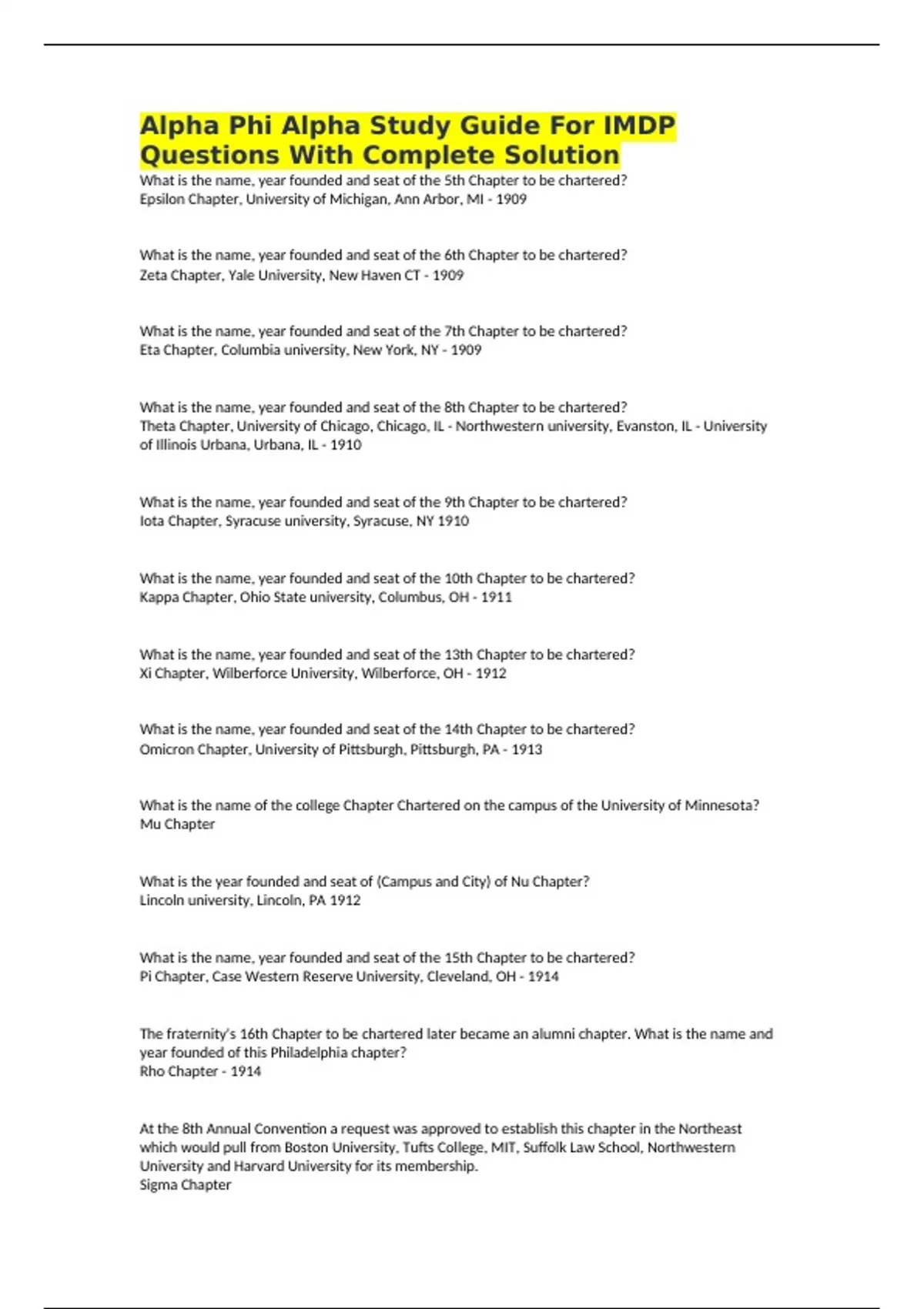 Alpha Phi Alpha Study Guide For IMDP Questions With Complete Solution What is the name, year founded and seat of the 5th Chapter to be chartered? Epsilon Chapter, University of Michigan, Ann Arbor, MI - 1909 What is the name, year founded and seat of the 6th Chapter to be chartered? Zeta Chapter, Yale University, New Haven CT - 1909 What is the name, year founded and seat of the 7th Chapter to be chartered? Eta Chapter, Columbia university, New York, NY - 1909 What is the name, year founded and seat of the 8th Chapter to be chartered? Theta Chapter, University of Chicago, Chicago, IL - Northwestern university, Evanston, IL - University of Illinois Urbana, Urbana, IL - 1910 What is the name, year founded and seat of the 9th Chapter to be chartered? Iota Chapter, Syracuse university, Syracuse, NY 1910 What is the name, year founded and seat of the 10th Chapter to be chartered? Kappa Chapter, Ohio State university, Columbus, OH - 1911 What is the name, year founded and seat of the 13th Chapter to be chartered? Xi Chapter, Wilberforce University, Wilberforce, OH - 1912 What is the name, year founded and seat of the 14th Chapter to be chartered? Omicron Chapter, University of Pittsburgh, Pittsburgh, PA - 1913 What is the name of the college Chapter Chartered on the campus of the University of Minnesota? Mu Chapter What is the year founded and seat of (Campus and City) of Nu Chapter? Lincoln university, Lincoln, PA 1912 What is the name, year founded and seat of the 15th Chapter to be chartered? Pi Chapter, Case Western Reserve University, Cleveland, OH - 1914 The fraternity's 16th Chapter to be chartered later became an alumni chapter. What is the name and year founded of this Philadelphia chapter? Rho Chapter - 1914 At the 8th Annual Convention a request was approved to establish this chapter in the Northeast which would pull from Boston University, Tufts College, MIT, Suffolk Law School, Northwestern University and Harvard University for its membership.