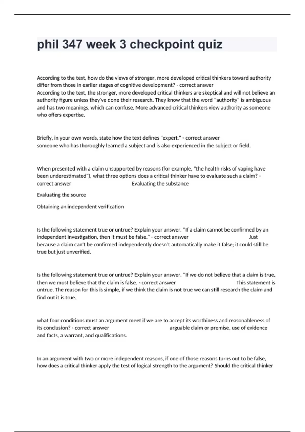 phil 347 week 3 checkpoint quiz Test Questions Fully Solved.