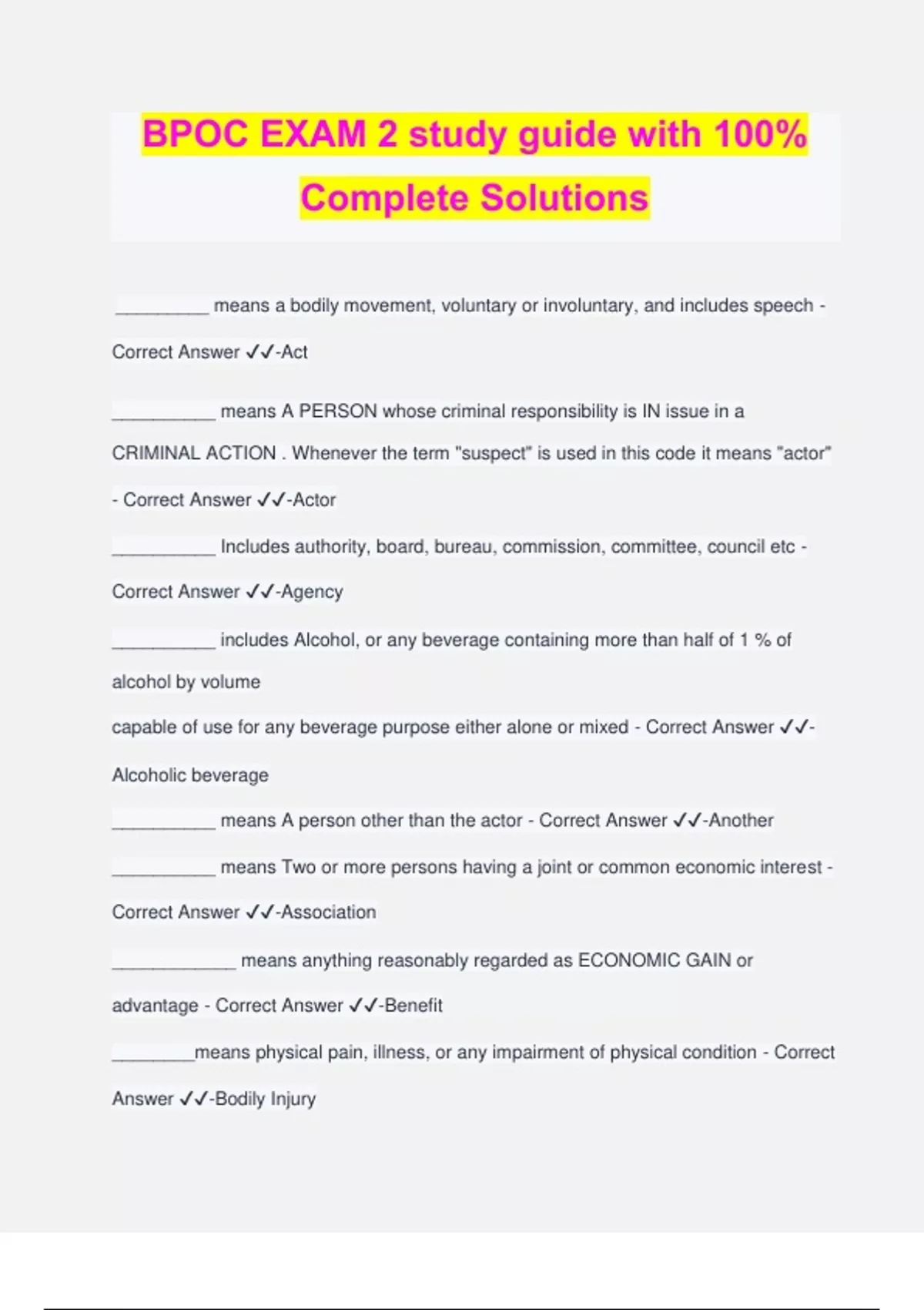 BPOC EXAM 2 study guide with 100% Complete Solutions _________ means a bodily movement, voluntary or involuntary, and includes speech - Correct Answer ️️ -Act __________ means A PERSON whose criminal responsibility is IN issue in a CRIMINAL ACTION . Whenever the term "suspect" is used in this code it means "actor" - Correct Answer ️️ -Actor __________ Includes authority, board, bureau, commission, committee, council etc - Correct Answer ️️ -Agency __________ includes Alcohol, or any beverage containing more than half of 1 % of alcohol by volume capable of use for any beverage purpose either alone or mixed - Correct Answer ️️ - Alcoholic beverage __________ means A person other than the actor - Correct Answer ️️ -Another __________ means Two or more persons having a joint or common economic interest - Correct Answer ️️ -Association ____________ means anything reasonably regarded as ECONOMIC GAIN or advantage - Correct Answer ️️ -Benefit ________means physical pain, illness, or any impairment of physical condition - Correct Answer ️️ -Bodily Injury ______________ is a FACILITY that houses only persons who have been CIVILY COMMITTED as sexually violent predators - Correct Answer ️️ -Civil Commitment Facility ___________ is A THREAT HOWEVER COMMITTED -to commit an offense -to inflict bodily injury -to accuse a person of any offense -to expose a person to hatred, contempt, or ridicule - Correct Answer ️️ -Coercion In regards to coercion what's the primary charge? - Correct Answer ️️ -Class A misdemeanor If the coercion is a threat to commit a felony what degree of felony is it? - Correct Answer ️️ -3rd degree ____________ is an act or omission and it's accompanying MENTAL STATE - Correct Answer ️️ -Conduct __________ is the assent (agreement) in fact, whether expressed or apparent (clearly understood) - Correct Answer ️️ -Consent ___________ is the aggregate weight of any mixture, solution or any other substance (drug, adulterant, and a dilutant ) - Correct Answer ️️ -Controlled Substance _____________ includes nonprofit corporations, professional associations created pursuant to statute, and joint stock companies - Correct Answer ️️ -Corporation _____________ is a place for the confinement of a person arrested, charged, or in violation of a CRIMINAL OFFENSE - Correct Answer ️️ -Correctional