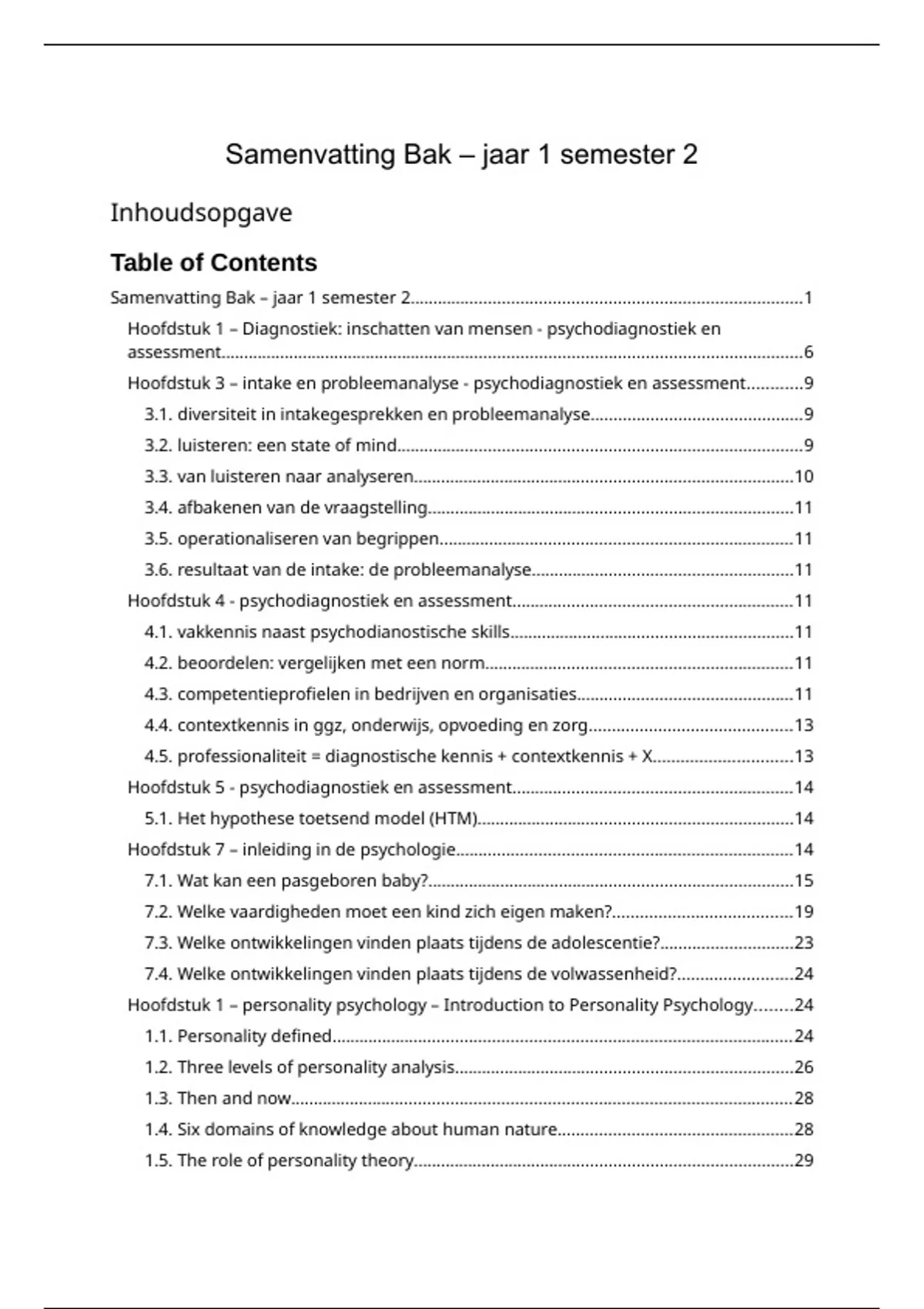Samenvatting bevat: - psychodiagnostiek en assesment: H1, H3, H4, H5, H9 - Inleiding in de psychologie: H7, H6, H8, H9, H2 - personality psychology: H1, H3, H4, H8, H9, H10, H5, H11, H13, H14, H12 - Ontwikkelingspsychologie ||: H2, H4, H1, H3 - Artikel CHC-model - Aandacht en executief functioneren - Taal en spraak - Emotie en sociale cognitie - Moraal en ethiek - Normatieve ideen - Meten van persoonlijkheid - Anatomy and research methods - Development of the brain - Plasticy after brain damage - Neuropsychologie taal: Engels en Nederlands