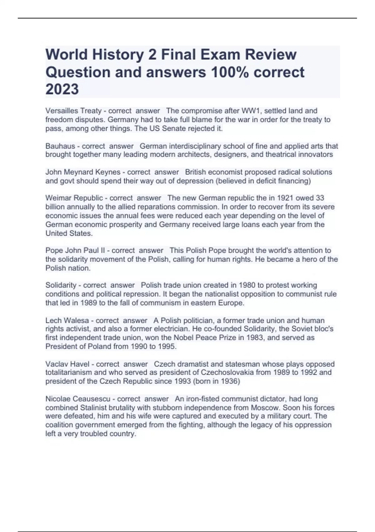 World History 2 Final Exam Review Question and answers 100% correct 2023Versailles Treaty - correct answer The compromise after WW1, settled land and freedom disputes. Germany had to take full blame for the war in order for the treaty to pass, among other things. The US Senate rejected it. Bauhaus - correct answer German interdisciplinary school of fine and applied arts that brought together many leading modern architects, designers, and theatrical innovators John Meynard Keynes - correct answer British economist proposed radical solutions and govt should spend their way out of depression (believed in deficit financing) Weimar Republic - correct answer The new German republic the in 1921 owed 33 billion annually to the allied reparations commission. In order to recover from its severe economic issues the annual fees were reduced each year depending on the level of German economic prosperity and Germany received large loans each year from the United States. Pope John Paul II - correct answer This Polish Pope brought the world's attention to the solidarity movement of the Polish, calling for human rights. He became a hero of the Polish nation. Solidarity - correct answer Polish trade union created in 1980 to protest working conditions and political repression. It began the nationalist opposition to communist rule that led in 1989 to the fall of communism in eastern Europe. Lech Walesa - correct answer A Polish politician, a former trade union and human rights activist, and also a former electrician. He co-founded Solidarity, the Soviet bloc's first independent trade union, won the Nobel Peace Prize in 1983, and served as President of Poland from 1990 to 1995. Vaclav Havel - correct answer Czech dramatist and statesman whose plays opposed totalitarianism and who served as president of Czechoslovakia from 1989 to 1992 and president of the Czech Republic since 1993 (born in 1936) Nicolae Ceausescu - correct answer An iron-fisted communist dictator, had long combined Stalinist brutality with stubborn independence from Moscow. Soon his forces were defeated, him and his wife were captured and executed by a military court. The coalition government emerged from the fighting, although the legacy of his oppression left a very troubled country.