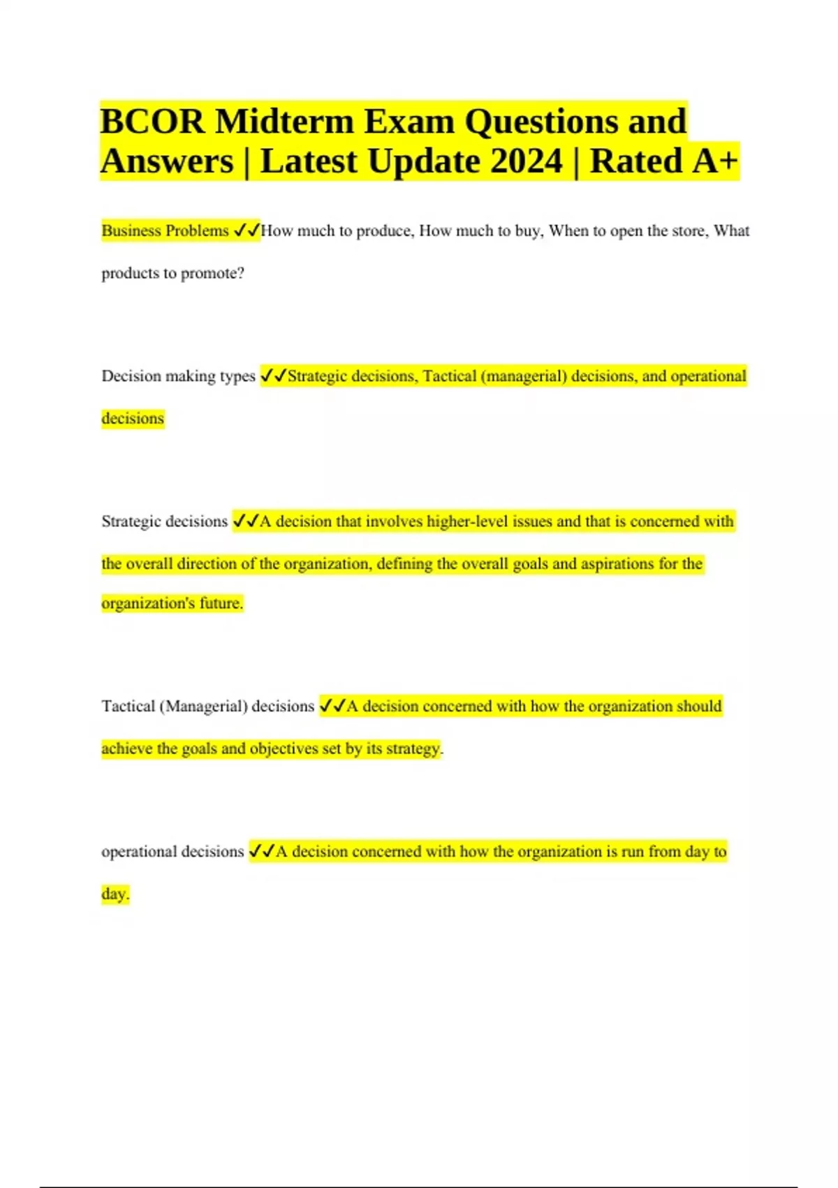 BCOR Midterm Exam Questions and Answers, Latest Update 2024/2025 Rated A+