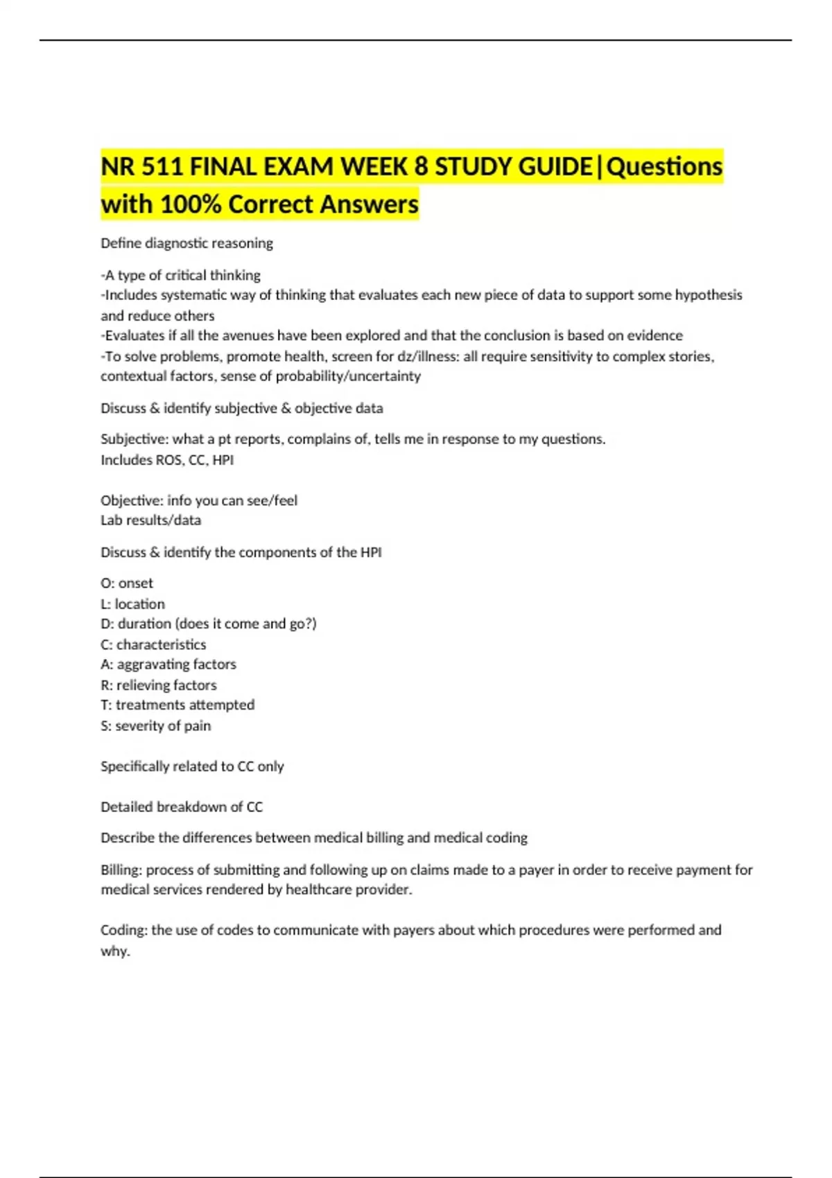 NR 511 FINAL EXAM WEEK 8 STUDY GUIDE|Questions with 100% Correct Answers Define diagnostic reasoning -A type of critical thinking -Includes systematic way of thinking that evaluates each new piece of data to support some hypothesis and reduce others -Evaluates if all the avenues have been explored and that the conclusion is based on evidence -To solve problems, promote health, screen for dz/illness: all require sensitivity to complex stories, contextual factors, sense of probability/uncertainty Discuss & identify subjective & objective data Subjective: what a pt reports, complains of, tells me in response to my questions. Includes ROS, CC, HPI Objective: info you can see/feel Lab results/data Discuss & identify the components of the HPI O: onset L: location D: duration (does it come and go?) C: characteristics A: aggravating factors R: relieving factors T: treatments attempted S: severity of pain Specifically related to CC only Detailed breakdown of CC Describe the differences between medical billing and medical coding Billing: process of submitting and following up on claims made to a payer in order to receive payment for medical services rendered by healthcare provider. Coding: the use of codes to communicate with payers about which procedures were performed and why. Compare & contrast the 2 coding classification systems that are currently used in the US healthcare system CPT: common procedural terminology Offical procedural rules and guidelines required when reporting services/procedures performed by providers Recognized universally Provide logical means to be able to tract healthcare data, trends, outcomes Represented by 5 digit code Every CPT must have dx that corresponds/explains why procedure was done ICD-10: 10th version Shorthand for pt's dx used to provide payer info on necessity of visit/procedure Which of the following statements are true? Eliciting a detailed hx through open-ended questioning and active listening offers critical clues to determining a dx. Obtaining meaningful hx involves collecting subjective info and organizing it into meaningful chunks of knowledge. Data acquisition in hx taking is most effective if it is hypothesis driven. All of the above All of the above Which of the following statements is NOT true regarding insurance? Providers are not required to follow the billing carrier's guidelines Discuss how specificity, sensitivity, predictive value contribute to usefulness of diagnostic data Specificity: greater when it has few false positives The number of true negatives divided by the number of all tested individuals who do not have the dz Sensitivity: greater when it has few false negatives The number of true positives divided by the number of tested individuals that do have the dz Predictive value: in part dependent on prevalence of condition Positive predictive value: the number of true positives divided by all those that are positive Negative predictive value: the number of true negatives divided by all those that are negative False positive: when a pt does NOT have dz, but has positive reading False negative: when a pt that DOES have dz, but has negative reading Discuss the elements that need to be considered when developing a plan Pt's preferences/actions Research evidence Clinical state/circumstances Clinical expertise Diagnostic testing (what tests need to be conducted to clarify assessment) Education (specific problems being managed) Follow-up (when will the pt need to be seen again) Be honest Negotiate what to cover Describe the components of medical decision making (MDM) in E&M coding Three key components that determine risk based E&M codes: History Physical MDM E&M coding requires a decision-maker MDM is another way of quantifying complexity of the thinking that is required for the visit Complexity of visit is based on 3 criteria: Risk Data Dx MDM score gives us credit for the excess work involved in management of a more complex pt. Correctly order the E&M office visit codes based on complexity from least to most complex New: 99201 (minimal/RN visit) 99202 (problem-focused) 99203 (expanded problem-focused) 99204 (detailed) 99205 (comprehensive) Established: 99211 (minimal/RN visit) 99212 (problem-focused) 99213 (expanded problem-focused 99214 (detailed) 99215 (comprehensive) Discuss a minimum of 3 purposes of the written H&P in relation to the importance of documentation -Important reference that gives concise info about pt's Hx and exam findings -Outlines plan for addressing issues that prompted visit. Info should be presented in logical fashion that prominently features all data immediately relevant to pt's condition. -A means of communicating info to all providers who are involved in care of the pt. -Important medical-legal document -Essential in order to accurately code and bill for services. Why does every procedure code need a corresponding dx code? To explain necessity of why it was done May represent actual procedure or nonprocedural encounter (like office visit) Correctly ID a pt as new or established given the historical info New: a pt who has not received services from this provider before or who has not been seen by provider in >3yrs Established: pt who has seen provider within last 3yrs ID 3 components required in determining an outpt office visit E&M code Plan of service Type of service Pt status Describe the components of MDM in E&M coding Risk Data Dx Explain what a well-rounded clinical experience means To experience a variety of pts during clinical across the lifespan 15% peds of total clinical time in program 15% women's health of total clinical time in program State max number of hrs that time can be spent rounding in a facility No more than 25% of total practicum hrs in that course State 9 things that must be documented when inputting data into clinical encounter Date of service Age Gender & ethnicity Visit E&M code Chief concern Procedures Tests performed/ordered Dx Level of involvement (mostly student, mostly preceptor, to
