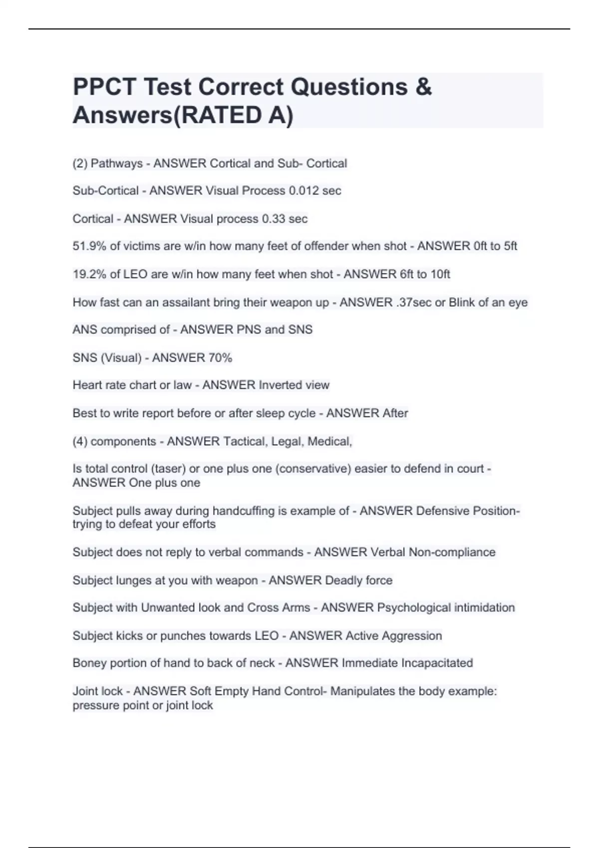 Subject pulls away during handcuffing is example of - ANSWER Defensive Position-
