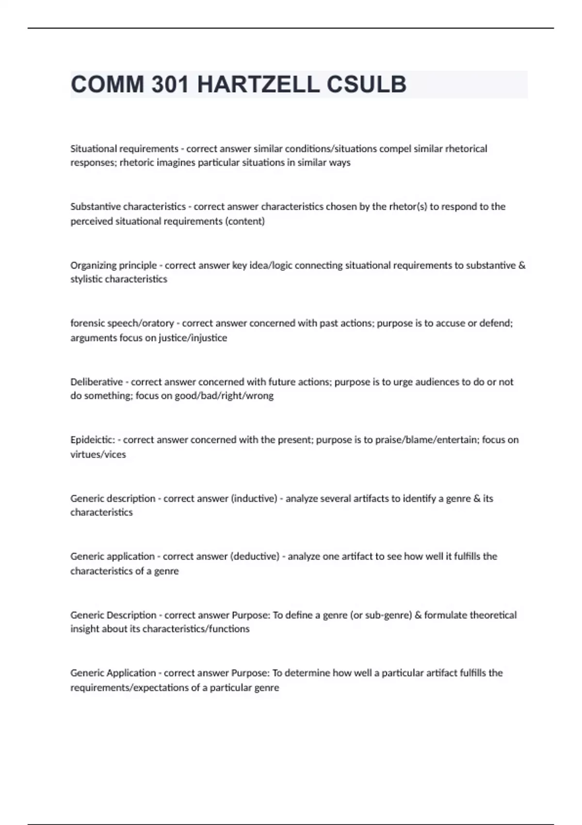 COMM 301 HARTZELL CSULB Question and answers correctly solved 2024COMM 301 HARTZELL CSULB Situational requirements - correct answer similar conditions/situations compel similar rhetorical responses; rhetoric imagines particular situations in similar ways Substantive characteristics - correct answer characteristics chosen by the rhetor(s) to respond to the perceived situational requirements (content) Organizing principle - correct answer key idea/logic connecting situational requirements to substantive & stylistic characteristics forensic speech/oratory - correct answer concerned with past actions; purpose is to accuse or defend; arguments focus on justice/injustice Deliberative - correct answer concerned with future actions; purpose is to urge audiences to do or not do something; focus on good/bad/right/wrong Epideictic: - correct answer concerned with the present; purpose is to praise/blame/entertain; focus on virtues/vices Generic description - correct answer (inductive) - analyze several artifacts to identify a genre & its characteristics Generic application - correct answer (deductive) - analyze one artifact to see how well it fulfills the characteristics of a genre Generic Description - correct answer Purpose: To define a genre (or sub-genre) & formulate theoretical insight about its characteristics/functions Generic Application - correct answer Purpose: To determine how well a particular artifact fulfills the requirements/expectations of a particul