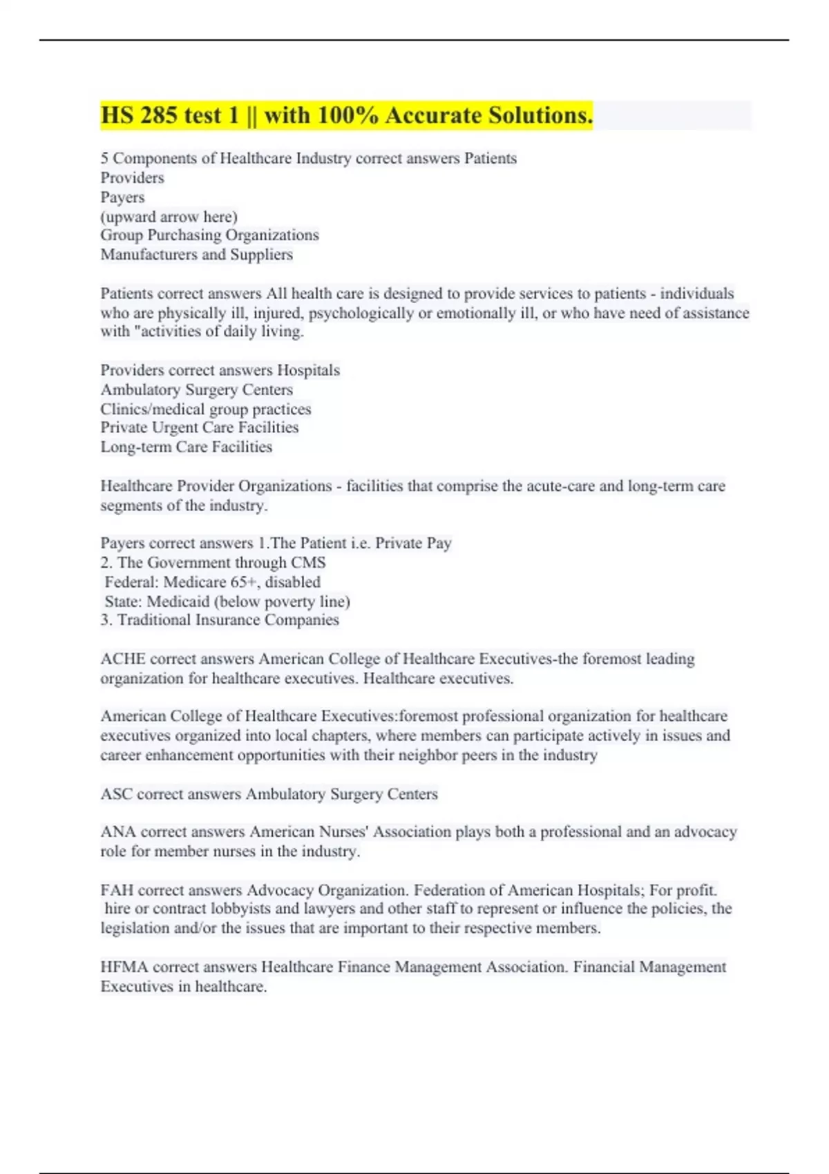 5 Components of Healthcare Industry correct answers Patients Providers Payers (upward arrow here) Group Purchasing Organizations Manufacturers and Suppliers Patients correct answers All health care is designed to provide services to patients - individuals who are physically ill, injured, psychologically or emotionally ill, or who have need of assistance with "activities of daily living. Providers correct answers Hospitals Ambulatory Surgery Centers Clinics/medical group practices Private Urgent Care Facilities Long-term Care Facilities Healthcare Provider Organizations - facilities that comprise the acute-care and long-term care segments of the industry. Payers correct answers 1.The Patient i.e. Private Pay 2. The Government through CMS Federal: Medicare 65+, disabled State: Medicaid (below poverty line) 3. Traditional Insurance Companies ACHE correct answers American College of Healthcare Executives-the foremost leading organization for healthcare executives. Healthcare executives. American College of Healthcare Executives:foremost professional organization for healthcare executives organized into local chapters, where members can participate actively in issues and career enhancement opportunities with their neighbor peers in the industry ASC correct answers Ambulatory Surgery Centers ANA correct answers American Nurses' Association plays both a professional and an advocacy role for member nurses in the industry. FAH correct answers Advocacy Organization. Federation of American Hospitals; For profit. hire or contract lobbyists and lawyers and other staff to represent or influence the policies, the legislation and/or the issues that are important to their respective members. HFMA correct answers Healthcare Finance Management Association. Financial Management Executives in healthcare.