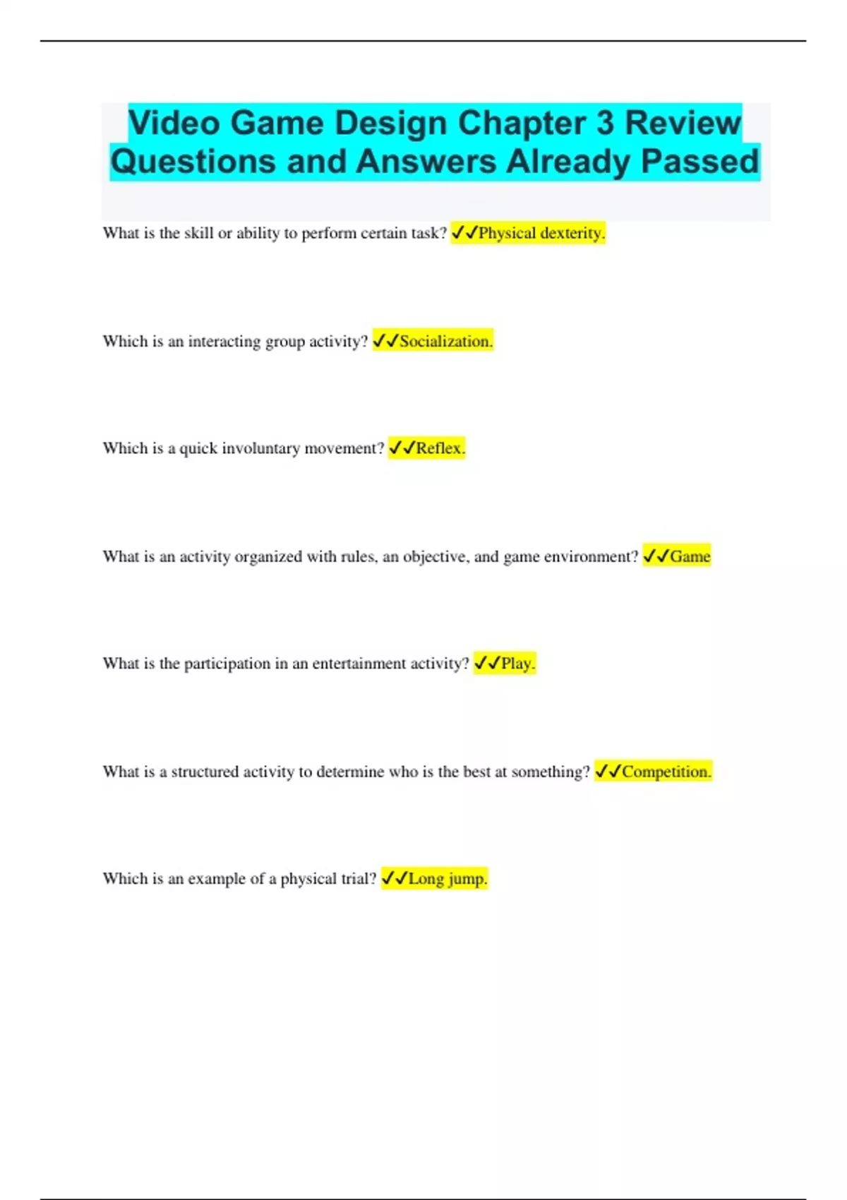 Video Game Design Chapter 3 Review Questions and Answers Already Passed