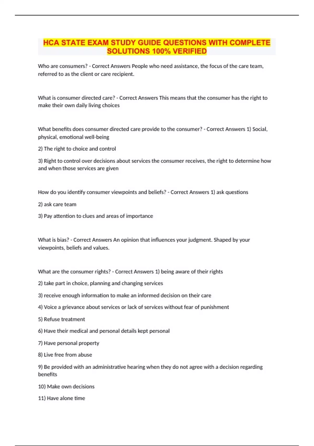 HCA STATE EXAM STUDY GUIDE QUESTIONS WITH COMPLETE SOLUTIONS 100% VERIFIED Who are consumers? - Correct Answers People who need assistance, the focus of the care team, referred to as the client or care recipient. What is consumer directed care? - Correct Answers This means that the consumer has the right to make their own daily living choices What benefits does consumer directed care provide to the consumer? - Correct Answers 1) Social, physical, emotional well-being 2) The right to choice and control 3) Right to control over decisions about services the consumer receives, the right to determine how and when those services are given How do you identify consumer viewpoints and beliefs? - Correct Answers 1) ask questions 2) ask care team 3) Pay attention to clues and areas of importance What is bias? - Correct Answers An opinion that influences your judgment. Shaped by your viewpoints, beliefs and values. What are the consumer rights? - Correct Answers 1) being aware of their rights 2) take part in choice, planning and changing services 3) receive enough information to make an informed decision on their care 4) Voice a grievance about services or lack of services without fear of punishment 5) Refuse treatment 6) Have their medical and personal details kept personal 7) Have personal property 8) Live free from abuse 9) Be provided with an administrative hearing when they do not agree with a decision regarding benefits 10) Make own decisions 11) Have alone time