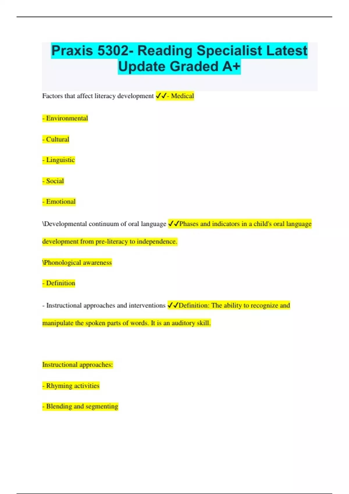 Praxis 5302- Reading Specialist Latest Update Graded A+ Factors that affect literacy development - Medical - Environmental - Cultural - Linguistic - Social - Emotional Developmental continuum of oral language Phases and indicators in a child's oral language development from pre-literacy to independence. Phonological awareness - Definition - Instructional approaches and interventions Definition: The ability to recognize and manipulate the spoken parts of words. It is an auditory skill. Instructional approaches: - Rhyming activities - Blending and segmenting - "Snail Talk" slow down words - Add or remove sounds to words - Identify sounds Phonemic awareness Definition Instructional approaches and interventions Part of phonological awareness. The ability to hear and manipulate individual phonemes. Instructional approaches: - Hearing, differentiating, and producing rhyme - Recognizing and differentiating sounds - Blending syllables - Segmentation Concepts of print Definition Instructional approaches and interventions Awareness of how books, print, and written language function. Instructional approaches: - Read left to right, top to bottom - Parts of the book - sentences start with capital letters and end with periods - Book handling - What is a word Alphabetic principle Definition Instructional approaches and interventions The understanding that letters/letter patterns represent the sounds of spoken language. Instruction: - Teach letter-sound relationships explicitly - Opportunities to practice in context - Add new ones and review learned ones frequently Decoding skills Definition Instructional approaches and interventions The ability to apply knowledge of letter-sound relationships to correctly pronounce written words. Instruction: - Explicit - Repetition - Phonic instruction - Opportunities for application - Manipulatives like sound boxes, magnetic letters, counters Printed-word recognition Students can quickly and automatically translate the letters or spelling patterns of written words into speech sounds so that they can identify words and access their meanings. Instruction: - Sight words - Opportunities for students to decode words and find their meanings - Opportunities to practice Spelling Definition Instructional approaches and interventions Three layers of English Spelling: - Alphabet sound: Learning to sound out each letter - Pattern: Recognizing what combinations of vowels/consonants make different sounds - Meaning: meanings of words and word parts Instructional approach/Intervention: Learning spelling patterns help decode new words in reading and pick up new words for writing. (Word study) Reading fluency Definition Instructional approaches and interventions Reading accurately, smoothly, and with expression. Recognizing words automatically. Instruction: - Modeling - Rereading texts