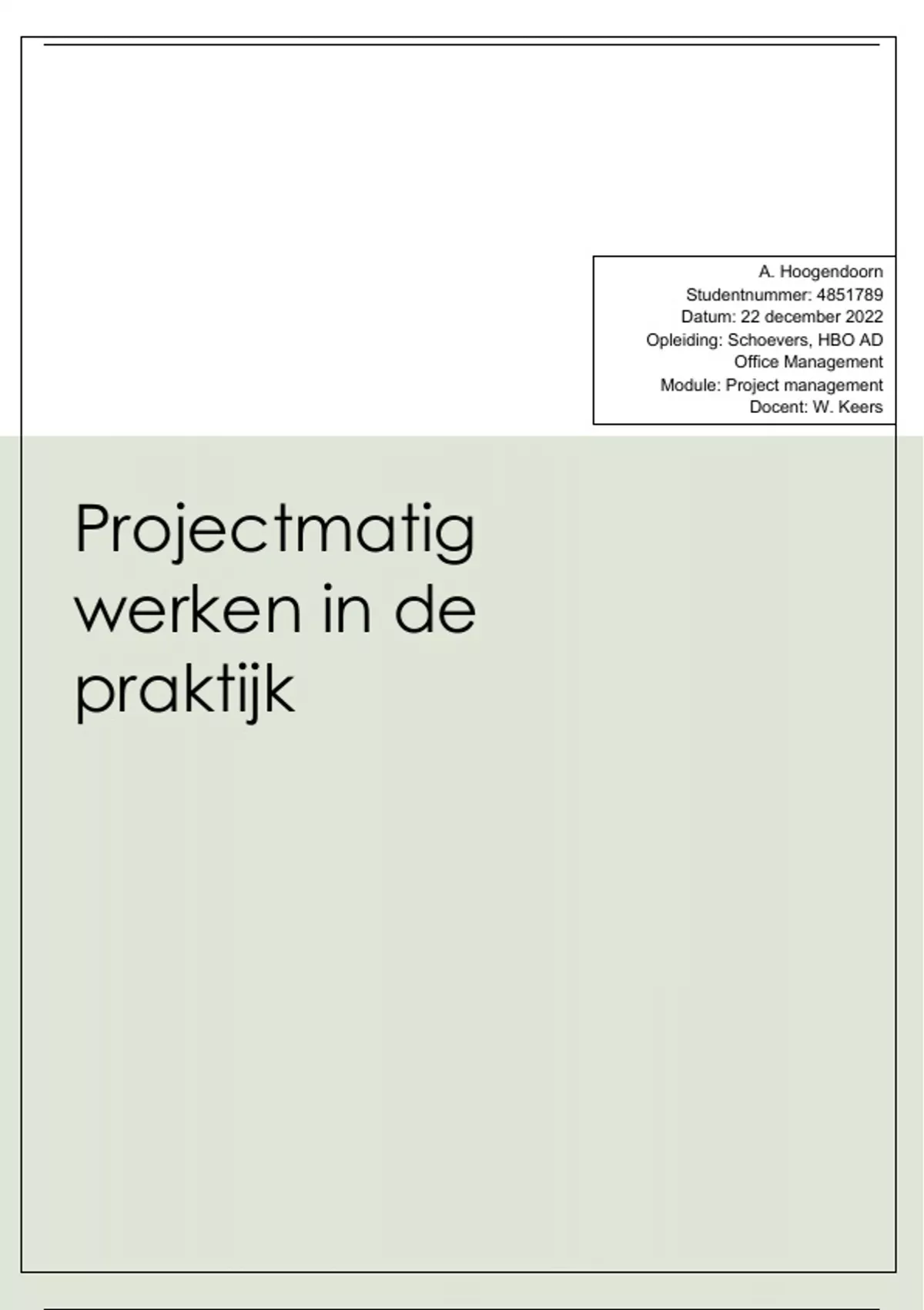 Case uitwerking Projectmanagement (cijfer 7) Schoevers HBO Associate Degree Office Management