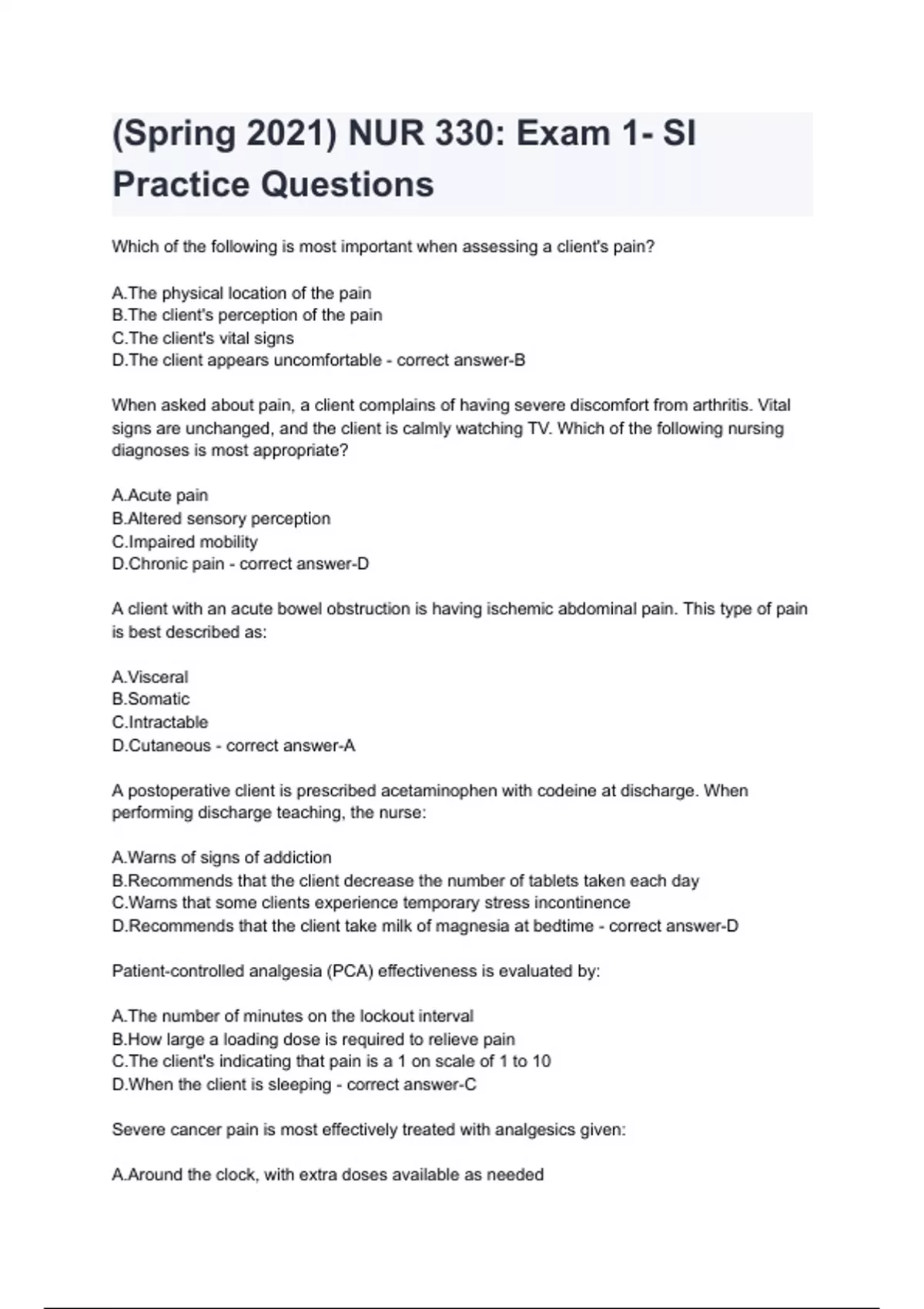 (Spring 2021) NUR 330_ Exam 1- SI Practice Questions with complete solution