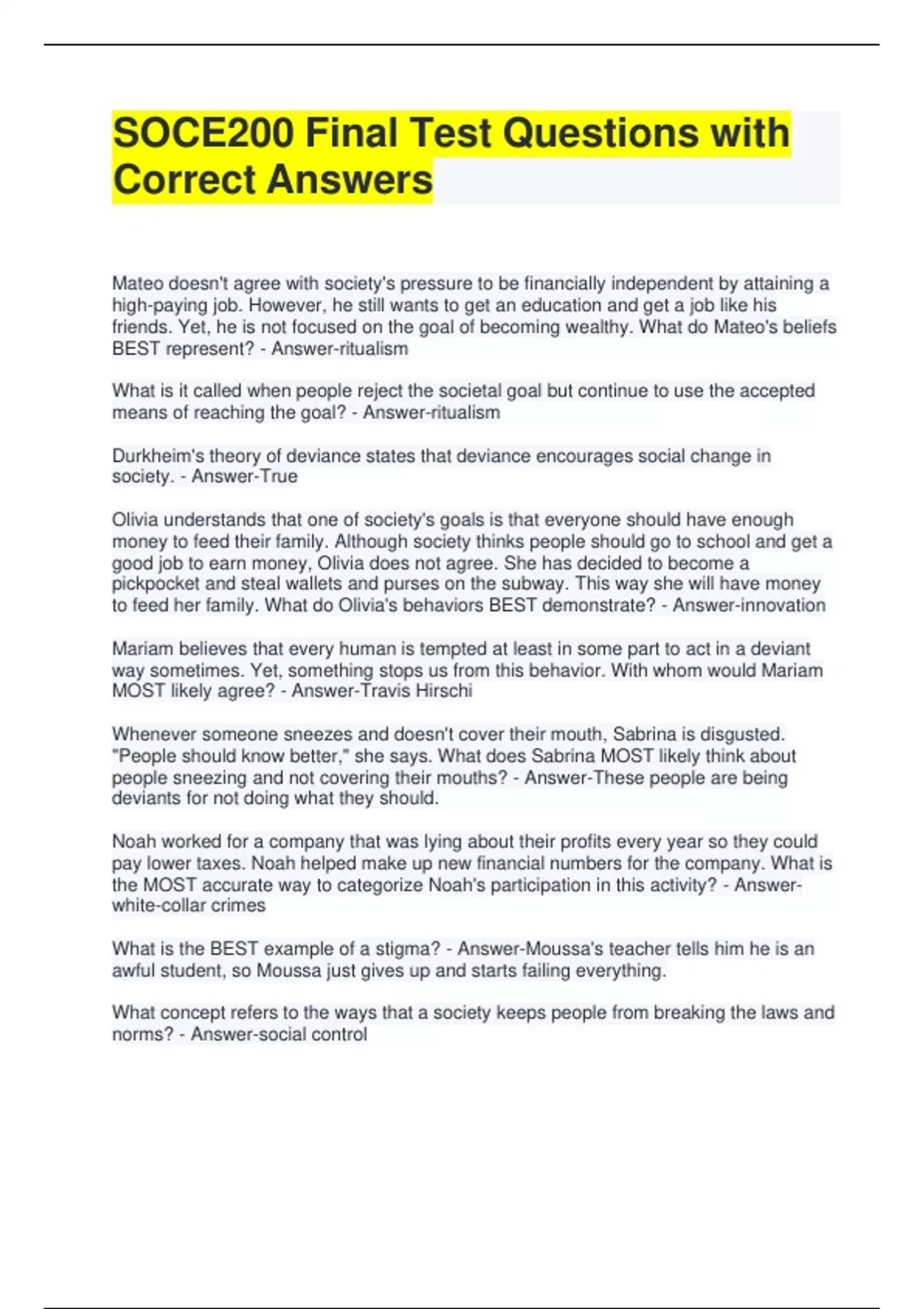 SOCE200 Final Test Questions with Correct Answers Mateo doesn't agree with society's pressure to be financially independent by attaining a high-paying job. However, he still wants to get an education and get a job like his friends. Yet, he is not focused on the goal of becoming wealthy. What do Mateo's beliefs BEST represent? - Answer-ritualism What is it called when people reject the societal goal but continue to use the accepted means of reaching the goal? - Answer-ritualism Durkheim's theory of deviance states that deviance encourages social change in society. - Answer-True Olivia understands that one of society's goals is that everyone should have enough money to feed their family. Although society thinks people should go to school and get a good job to earn money, Olivia does not agree. She has decided to become a pickpocket and steal wallets and purses on the subway. This way she will have money to feed her family. What do Olivia's behaviors BEST demonstrate? - Answer-innovation Mariam believes that every human is tempted at least in some part to act in a deviant way sometimes. Yet, something stops us from this behavior. With whom would Mariam MOST likely agree? - Answer-Travis Hirschi Whenever someone sneezes and doesn't cover their mouth, Sabrina is disgusted. "People should know better," she says. What does Sabrina MOST likely think about people sneezing and not covering their mouths? - Answer-These people are being deviants for not doing what they should. Noah worked for a company that was lying about their profits every year so they could pay lower taxes. Noah helped make up new financial numbers for the company. What is the MOST accurate way to categorize Noah's participation in this activity? - Answer- white-collar crimes What is the BEST example of a stigma? - Answer-Moussa's teacher tells him he is an awful student, so Moussa just gives up and starts failing everything. What concept refers to the ways that a society keeps people from breaking the laws and norms? - Answer-social control The United States has a high rate of recidivism. What does this MOST likely mean? - Answer-People are still likely to repeat criminal behavior even if they have been arrested. What is an idea that is included in Travis Hirschi's control theory? - Answer-If a person feels that they can't get ahead in life, they are more likely to engage in deviance. Bruno got mad at the boy who sits next to him on the bus, so he punched him in the face. How would the FBI MOST likely describe this deviant behavior? - Answer-crimes against the person Emma went into her friend's locker without her permission and stole all of the money out of her purse. How would the FBI MOST likely classify this criminal act? - Answer-crimes against property Giving someone a dirty look for cutting in front of you is an example of social control. - Answer-True With which statement would Howard Becker be MOST likely to agree? - Answer- Deviant behavior exists only because people have decided to define it as deviant. Aarav was born in India. What does this MOST likely mean for his social stratification system? - Answer-He will have limits to the occupations he can choose. One of the presidential candidates is telling the public that his focus is to help working- class people improve their living conditions. What is MOST likely true about his plan? - Answer-It will help people attend college who previously couldn't afford it. Women are more likely than men to live in poverty. - Answer-True When Mia was in her 20s, she was considered lower class. She made enough money to go to college and continued working as she completed her studies. Now, Mia is a 40- year-old lawyer who has a great apartment in the city. She is considered upper-middle class. What does this scenario BEST demonstrate? - Answer-upward mobility Lily has been a teacher for 20 years. She has decided to leave her job as a teacher and start working for a textbook company. She will make about the same salary with the change, but she is looking forward to a less stressful career. What does Lily's transition BEST represent? - Answer-horizontal mobility A political candidate is running on a plan that will make everyone receive equal pay, no matter what their occupation is. How would Davis and Moore MOST likely respond to this proposal? - Answer-If people earn the same, they will stop trying as hard to succeed. Lorenzo has worked five different jobs in the past five years. It seems like any job he starts ends with a company shutting down and laying off workers. He finished high school, but he hasn't had time (or money) to pursue a college degree. With yearly earnings of about $20,000, he struggles to meet the day-to-day needs of his family. How would you BEST classify Lorenzo's social ranking? - Answer-lower class In the United States, people from which age group are MOST likely to be poor? - Answer-children What is TRUE about social mobility in the United States? - Answer-More recently, the middle class has become smaller. What is TRUE about social stratification? - Answer-Social stratification is a trait of society.