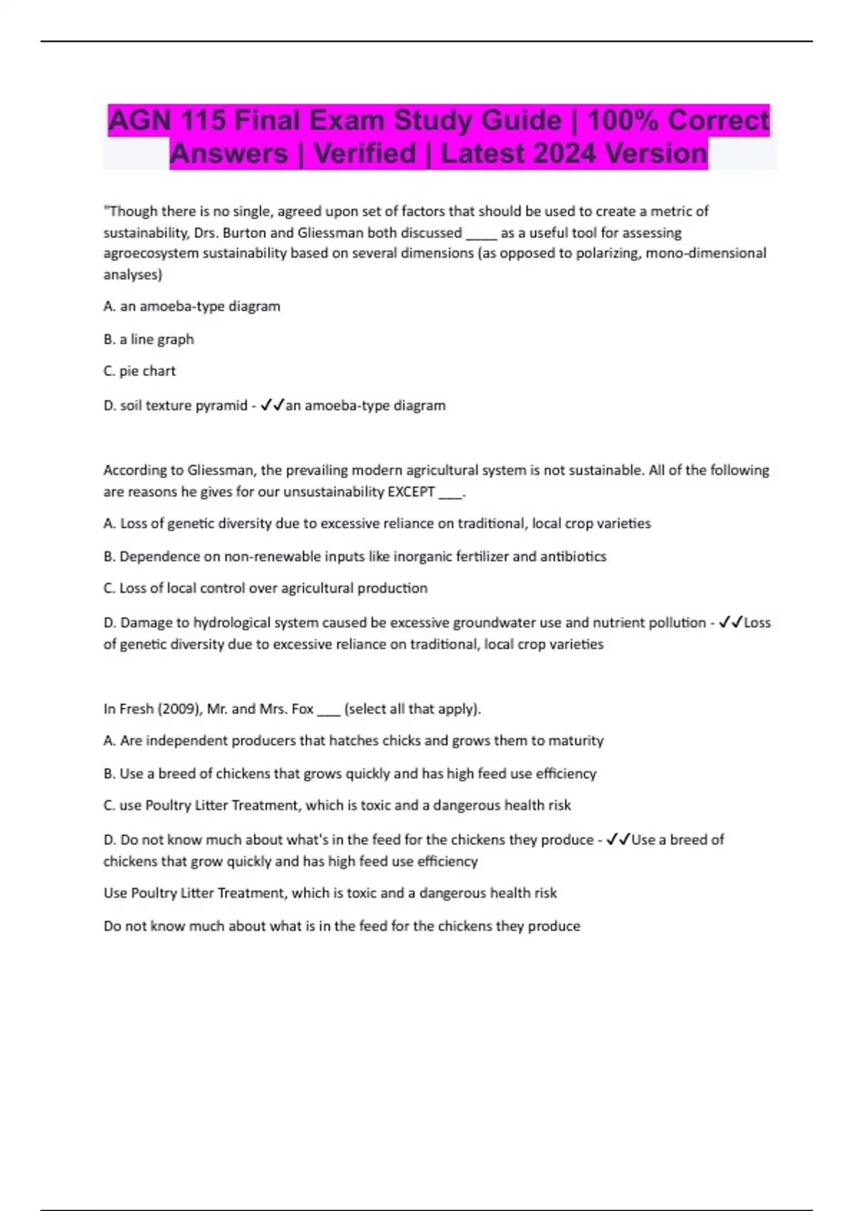 "Though there is no single, agreed upon set of factors that should be used to create a metric of sustainability, Drs. Burton and Gliessman both discussed ____ as a useful tool for assessing agroecosystem sustainability based on several dimensions (as opposed to polarizing, mono-dimensional analyses) A. an amoeba-type diagram B. a line graph C. pie chart D. soil texture pyramid - an amoeba-type diagram According to Gliessman, the prevailing modern agricultural system is not sustainable. All of the following are reasons he gives for our unsustainability EXCEPT ___. A. Loss of genetic diversity due to excessive reliance on traditional, local crop varieties B. Dependence on non-renewable inputs like inorganic fertilizer and antibiotics C. Loss of local control over agricultural production D. Damage to hydrological system caused be excessive groundwater use and nutrient pollution - Loss of genetic diversity due to excessive reliance on traditional, local crop varieties In Fresh (2009), Mr. and Mrs. Fox ___ (select all that apply). A. Are independent producers that hatches chicks and grows them to maturity B. Use a breed of chickens that grows quickly and has high feed use efficiency C. use Poultry Litter Treatment, which is toxic and a dangerous health risk D. Do not know much about what's in the feed for the chickens they produce - Use a breed of chickens that grow quickly and has high feed use efficiency Use Poultry Litter Treatment, which is toxic and a dangerous health risk Do not know much about what is in the feed for the chickens they produceT/F: Norman Borlaug greatly increased yields for farmers in Mexico, India and Pakistan using classical breeding techniques to produce a rust-resistant, dwarf wheat variety that was especially responsive to fertilization and irrigation. - True In Fresh, Andrew Kimbrell (Executive Director, The Center for Food Safety) said that new data show that "medium-sized organic [production systems] are far more productive than any sized conventional [production systems]"; however, data from recent university studies show that organic systems are usually ____. A. trick question; no data exists that make this comparison B. Similar to or higher in yield than conventional systems C. Equal to or lower yielding than conventional systems D. Yield more than twice as much as conventional systems - Equal to or lower yielding than conventional systems "Reliance on synthetic or mineral fertilizer." This would normally e associated with: A. Sustainable Agriculture B. Conventional Agriculture - Conventional agriculture Thomas Malthus, an Anglican rector with a good mind for mathematics, became concerned about the inevitability of widespread human misery. In a 1798 essay, he forecast that widespread starvation and conflict would be the resul