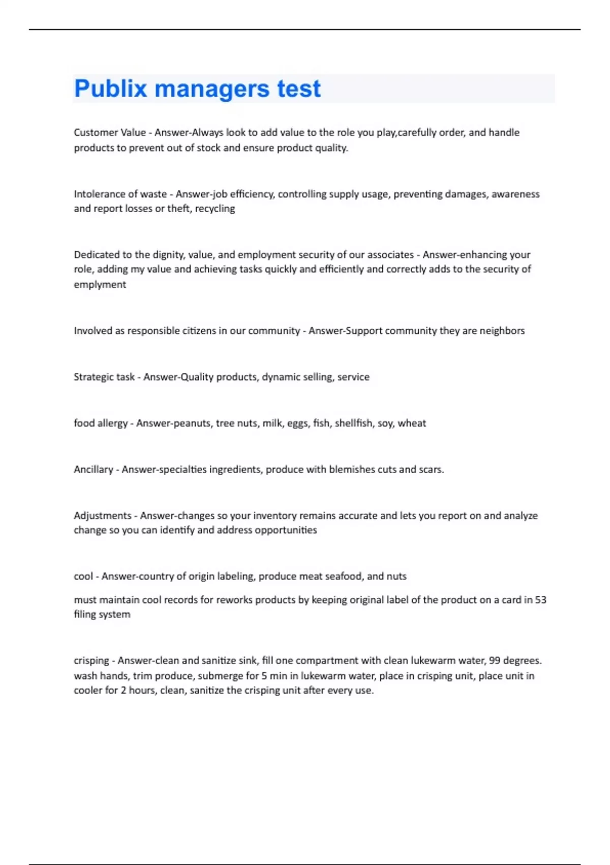 Customer Value - Answer-Always look to add value to the role you play,carefully order, and handle products to prevent out of stock and ensure product quality. Intolerance of waste - Answer-job efficiency, controlling supply usage, preventing damages, awareness and report losses or theft, recycling Dedicated to the dignity, value, and employment security of our associates - Answer-enhancing your role, adding my value and achieving tasks quickly and efficiently and correctly adds to the security of emplyment Involved as responsible citizens in our community - Answer-Support community they are neighbors Strategic task - Answer-Quality products, dynamic selling, service food allergy - Answer-peanuts, tree nuts, milk, eggs, fish, shellfish, soy, wheat Ancillary - Answer-specialties ingredients, produce with blemishes cuts and scars. Adjustments - Answer-changes so your inventory remains accurate and lets you report on and analyze change so you can identify and address opportunities cool - Answer-country of origin labeling, produce meat seafood, and nuts must maintain cool records for reworks products by keeping original label of the product on a card in 53 filing system crisping - Answer-clean and sanitize sink, fill one compartment with clean lukewarm water, 99 degrees. wash hands, trim produce, submerge for 5 min in lukewarm water, place in crisping unit, place unit in cooler for 2 hours, clean, sanitize the crisping unit after every - Answer-stay cool apologize for the problem listen with empathy make it right 4 steps Customer service - Answer-greet customer by name if possible and smile use observation skills to engage the customer thanks the customer and invite them back speak and smile at everyone within 10 feet of you and greet within 10 seconds of their arrival in your department team - Answer-together everyone achieves more PPE - Answer-aprons slip resistant shoes, gloves, goggles SDS - Answer-safety data sheets, which comply with OSHA requirements and provide info on publix connect food grade oil - Answer-cannot be stored with other chemicals or water bottles