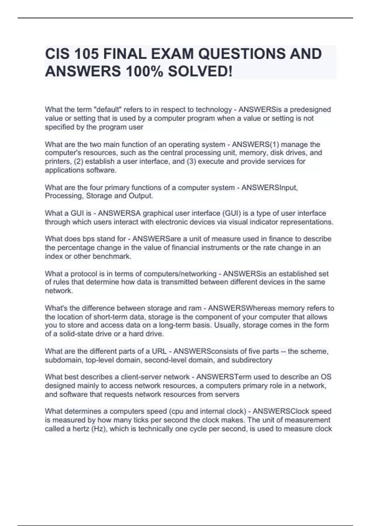 cis 105 final exam questions and answers 100 solv