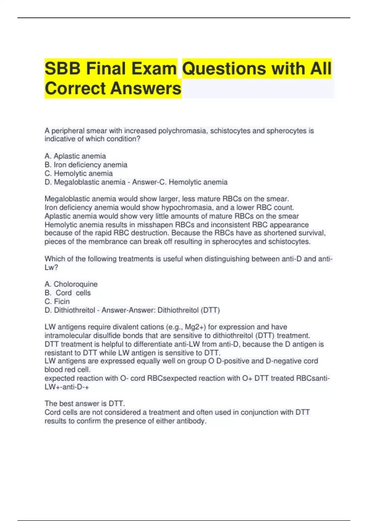 SBB Final Exam Questions with All Correct Answers (1) A peripheral smear with increased polychromasia, schistocytes and spherocytes is indicative of which condition? A. Aplastic anemia B. Iron deficiency anemia C. Hemolytic anemia D. Megaloblastic anemia - Answer-C. Hemolytic anemia Megaloblastic anemia would show larger, less mature RBCs on the smear. Iron deficiency anemia would show hypochromasia, and a lower RBC count. Aplastic anemia would show very little amounts of mature RBCs on the smear Hemolytic anemia results in misshapen RBCs and inconsistent RBC appearance because of the rapid RBC destruction. Because the RBCs have as shortened survival, pieces of the membrance can break off resulting in spherocytes and schistocytes. Which of the following treatments is useful when distinguishing between anti-D and anti- Lw? A. Choloroquine B. Cord cells C. Ficin D. Dithiothreitol - Answer-Answer: Dithiothreitol (DTT) LW antigens require divalent cations (e.g., Mg2+) for expression and have intramolecular disulfide bonds that are sensitive to dithiothreitol (DTT) treatment. DTT treatment is helpful to differentiate anti-LW from anti-D, because the D antigen is resistant to DTT while LW antigen is sensitive to DTT. LW antigens are expressed equally well on group O D-positive and D-negative cord blood red cell. expected reaction with O- cord RBCsexpected reaction with O+ DTT treated RBCsanti- LW+-anti-D-+ The best answer is DTT. Cord cells are not considered a treatment and often used in conjunction with DTT results to confirm the presence of either antibody. ficin (breaks down proteins) and chloroquine (dissociates bound antibody from RBCs/ destroys HLA antigens) do not disrupt disulfide bonds. Therapeutic plasma exchange is most useful in treating patients with: A. Circulating immune complexes B. Autoimmune diseases C. high titer IgG anti-D D. Hyperimmune synromes - Answer-Correct: Circulating Immune Complexes Plasma exchange is used to help a temporary condition. So an autoimmune disease is better treated with the use of steroids and other medicines that will suppress the autoantibody production. A patient with high titer anti-D is actively producing anti-D. So these patients will also not benefit from plasma exchange since their immune system is just going to produce more anti-D. Patients with hyperimmune syndromes are also actively producing harmful substances, so removing them won't be effective since more will be produced as soon as the procedure is completed. Circulating immune complexes are a condition that is caused by antigen-antibody reaction due to a short lived condition, so the use of plasma exchange is very effective in removing those large complexes. With additional treatment, we can prevent more immune complexes from forming so once the exchange is complete, the condition is most often resolved. Which of the following donors is eligible to donate? A. Wife of a patient with active Hepatitis ; they are living together; last sexual contact was 18 months ago. B. Former prostitute; married with no high-risk behavior for 10 years C. Male who had sex with another male 11 months ago D. Male jailed for 7 days, 15 months ago - Answer-Correct: Male jailed for 7 days, 15 months ago AABB standards (32nd ed): Incarceration for more than 72 consecutive hours defers the donor for 12 months from the date of release. Because this donor was released 15 months ago, he is eligible. A person living with an individual with active Hepatitis is deferred. There would also be deferral for 12 months from the date of the last sexual contact. Once the infection is no longer present, the donor is eligible 12 months from the date the spouse's infection is deemed as no longer present. Potential donors who have taken money or drugs for sex since 1977 are indefinitely deferred. Males who have had sexual relations with other males are deferred for 12 months after the last date of sexual contact. (recently changed due to COVID-19, however ASCP is currently using pre-pandemic donor requirements!) A Native American woman who is group A Positive delivered a group O Rh positive infant. The baby was noted to be jaundiced 6 hours after birth and had a 3+ DAT. The mother's antibody screen had been negative before delivery and an eluate prepared from the infant's cells was also non-reactive with a routine antibody ID panel, A1 and B cells. Which of the following cells should be tested to possibly assist in identification of the antibody? A. Doa B. Dia C. Cha D, Coa - Answer-Correct: Dia The clues here are as follows: You want to look for an antibody that is capable of causing a significant HDFN. Anti-Cha is an antibody with high titer, low avidity (HTLA) characteristics. The antigen is not an integral part of the RBC membrane but rather is formed in the fluids and adsorbs onto the RBC. The antibody has weak reactivity and a low binding ability. The antigens are not fully developed at birth and the antibody is weak and not capable of causing HDFN. So you can rule out that antibody right away. In addition, you would likely see weaker reactions at AHG in the mom's serum tested with the antibody panel, and the infant DAT would be negative. Doa is an antigen that is expressed as a part of the RBC membrane, Anti-Doa can cause HTR, but does not typically cause HDFN. The antigen is present on about 65% of individuals from Northern European descent, so again, the antibody would likely react in a routine antibody ID panel. Coa is a high frequency antigen, so an anti-Coa in the eluate would have reacted with all panel cells and the A1, B cells as well. IT would also show up in the serum. Anti-Coa is capable of causing HDFN, but the pattern of reactivity here does not correspond to the results for this situation. Dia is a low prevalence antigen in Caucasians, African Americans, African individuals and European individuals. The antigen is positive in approximately 11% of Native Americans, about 2% in South Americans, 12% in Japanes