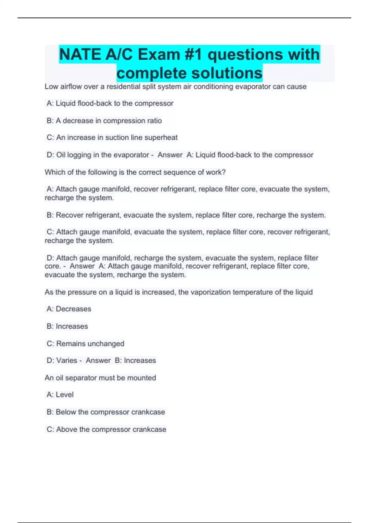 NATE A/C Exam #1 questions with complete solutions Low airflow over a residential split system air conditioning evaporator can cause A: Liquid flood-back to the compressor B: A decrease in compression ratio C: An increase in suction line superheat D: Oil logging in the evaporator - Answer A: Liquid flood-back to the compressor Which of the following is the correct sequence of work? A: Attach gauge manifold, recover refrigerant, replace filter core, evacuate the system, recharge the system. B: Recover refrigerant, evacuate the system, replace filter core, recharge the system. C: Attach gauge manifold, evacuate the system, replace filter core, recover refrigerant, recharge the system. D: Attach gauge manifold, recharge the system, evacuate the system, replace filter core. - Answer A: Attach gauge manifold, recover refrigerant, replace filter core, evacuate the system, recharge the system. As the pressure on a liquid is increased, the vaporization temperature of the liquid A: Decreases B: Increases C: Remains unchanged D: Varies - Answer B: Increases An oil separator must be mounted A: Level B: Below the compressor crankcase C: Above the compressor crankcase