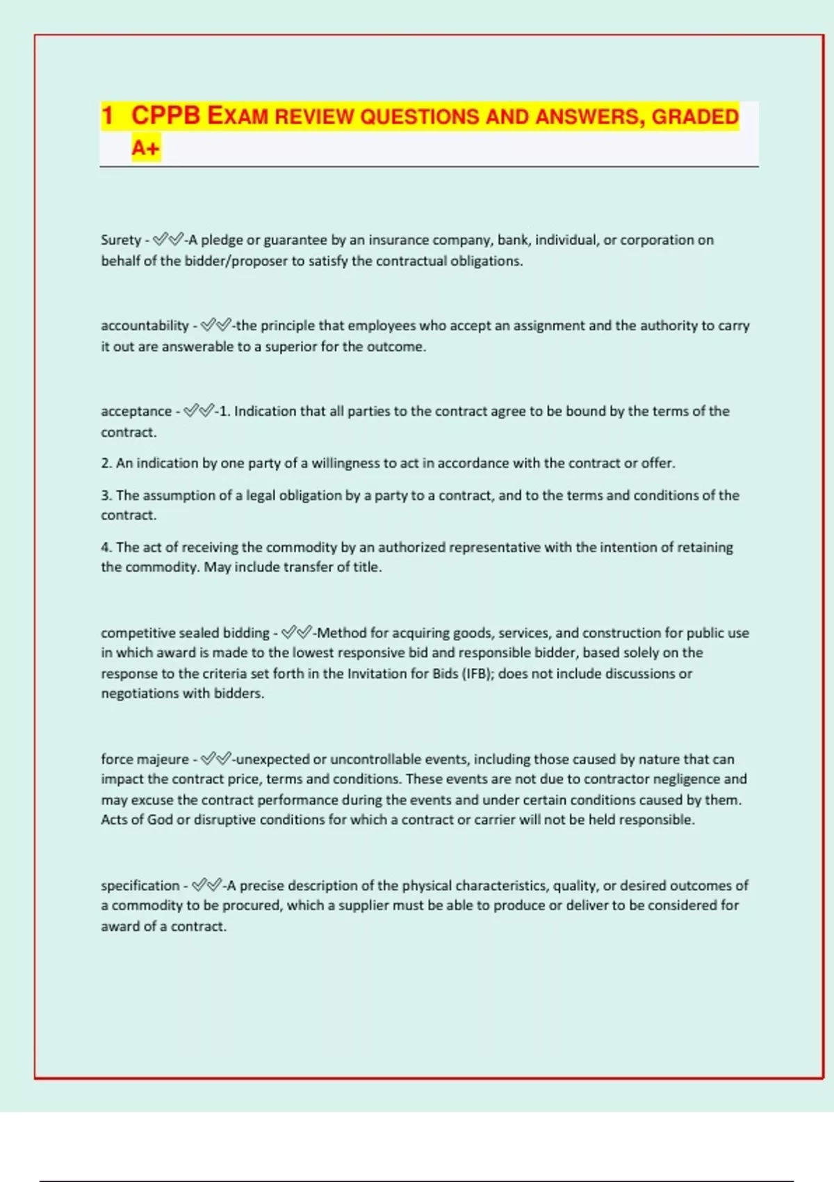 CPPB EXAM REVIEW QUESTIONS AND ANSWERS, GRADED A+ Surety - -A pledge or guarantee by an insurance company, bank, individual, or corporation on behalf of the bidder/proposer to satisfy the contractual obligations. accountability - -the principle that employees who accept an assignment and the authority to carry it out are answerable to a superior for the outcome. acceptance - -1. Indication that all parties to the contract agree to be bound by the terms of the contract. 2. An indication by one party of a willingness to act in accordance with the contract or offer. 3. The assumption of a legal obligation by a party to a contract, and to the terms and conditions of the contract. 4. The act of receiving the commodity by an authorized representative with the intention of retaining the commodity. May include transfer of title. competitive sealed bidding - -Method for acquiring goods, services, and construction for public use in which award is made to the lowest responsive bid and responsible bidder, based solely on the response to the criteria set forth in the Invitation for Bids (IFB); does not include discussions or negotiations with bidders. force majeure - -unexpected or uncontrollable events, including those caused by nature that can impact the contract price, terms and conditions. These events are not due to contractor negligence and may excuse the contract performance during the events and under certain conditions caused by them. Acts of God or disruptive conditions for which a contract or carrier will not be held responsible. specification - -A precise description of the physical characteristics, quality, or desired outcomes of a commodity to be procured, which a supplier must be able to produce or deliver to be considered for award of a contract. Bid Bond - -An insurance agreement, accompanied by monetary commitment, by which a third party (the surety) accepts liability and guarantees that the bidder will not withdraw the bid. The bidder will furnish bonds in the required amount and if the contract is awarded to the bonded bidder, the bidder will accept the contract as bid, or else the surety will pay a specific amount. warranty - -A promise made by a seller that is legally enforceable. The promise may be expressed or implied and is legally binding. best practice - -A business process, activity, or operation that is considered outstanding, innovative, or exceptionally creative by a recognized peer group. It may be considered as a leading-edge activity that has been successfully adopted or implemented, and has brought efficiency and effectiveness to an organization. It may result in improved productivity, quality, reduced costs, and increased customer service. return on investment or ROI - -A calculation used in business to determine whether a proposed investment is a wise business decision and how well it will repay the investor. It is calculated as the ratio of the amounted gained or lost relative to the basis. The analysis takes the form of a dynamic model or a statistical model. estoppel - -A legal principle that prevents a person from asserting a position that is inconsistent with his or her prior conduct, if injustice would thereby result to a person who has changed position in justifiable reliance upon that conduct. For example, a landlord might inform a tenant that rent has been reduced, due to construction or lapse in utility service. If the tenant relies on this advice, the landlord could be estopped from collecting rent retroactively.
