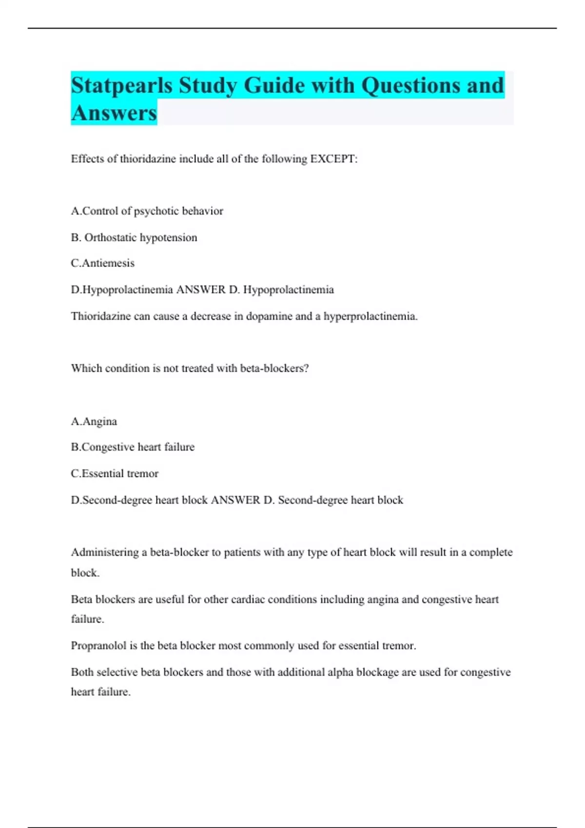 Statpearls Study Guide with Questions and Answers Effects of thioridazine include all of the following EXCEPT: A.Control of psychotic behavior B. Orthostatic hypotension C.Antiemesis D.Hypoprolactinemia ANSWER D. Hypoprolactinemia Thioridazine can cause a decrease in dopamine and a hyperprolactinemia. Which condition is not treated with beta-blockers? A.Angina B.Congestive heart failure C.Essential tremor D.Second-degree heart block ANSWER D. Second-degree heart block Administering a beta-blocker to patients with any type of heart block will result in a complete block. Beta blockers are useful for other cardiac conditions including angina and congestive heart failure. Propranolol is the beta blocker most commonly used for essential tremor. Both selective beta blockers and those with additional alpha blockage are used for congestive heart failure.