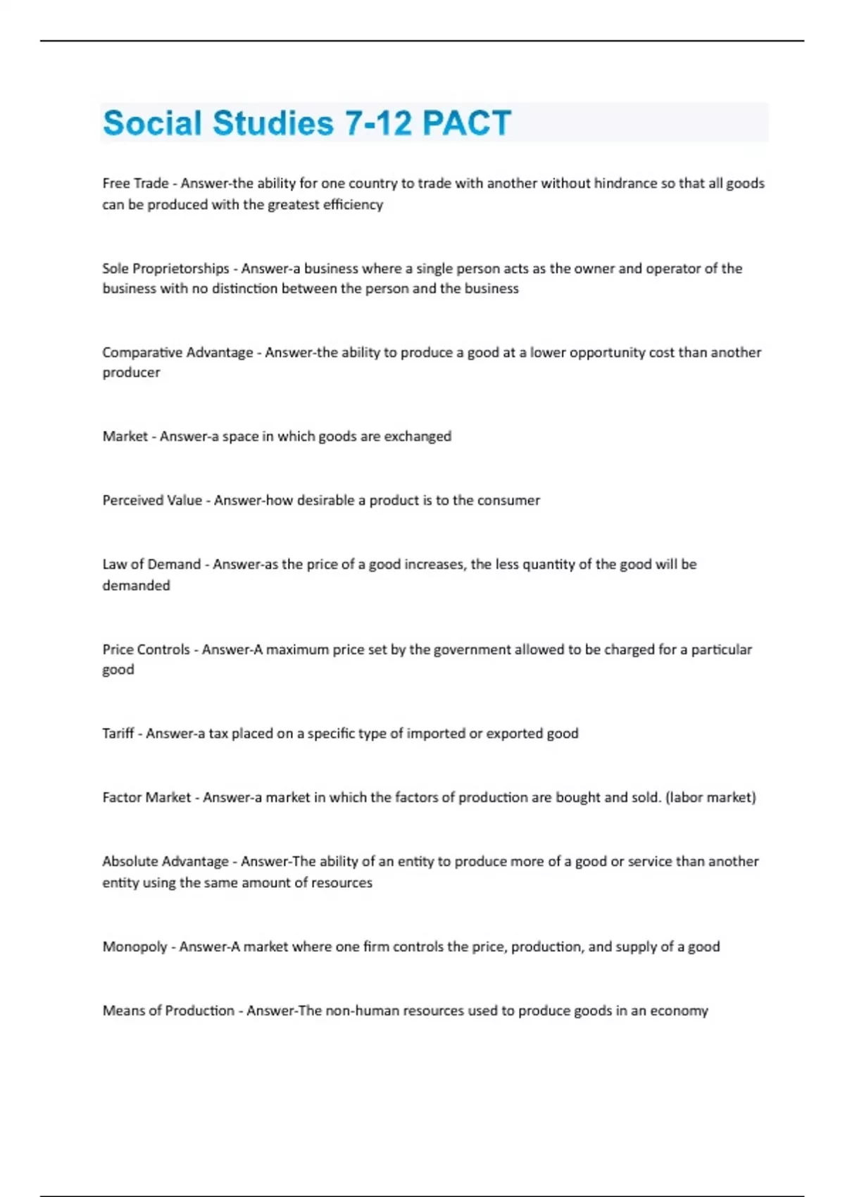 Free Trade - Answer-the ability for one country to trade with another without hindrance so that all goods can be produced with the greatest efficiency Sole Proprietorships - Answer-a business where a single person acts as the owner and operator of the business with no distinction between the person and the business Comparative Advantage - Answer-the ability to produce a good at a lower opportunity cost than another producer Market - Answer-a space in which goods are exchanged Perceived Value - Answer-how desirable a product is to the consumer Law of Demand - Answer-as the price of a good increases, the less quantity of the good will be demanded Price Controls - Answer-A maximum price set by the government allowed to be charged for a particular good Tariff - Answer-a tax placed on a specific type of imported or exported good Factor Market - Answer-a market in which the factors of production are bought and sold. (labor market) Absolute Advantage - Answer-The ability of an entity to produce more of a good or service than another entity using the same amount of resources Monopoly - Answer-A market where one firm controls the price, production, and supply of a good Means of Production - Answer-The non-human resources used to produce goods in an economyOligopoly - Answer-A market where only a few sellers are present Cost-Benefit Analysis - Answer-Consideration of what one gains and loses from a set of economic choices Interdependence of Economies - Answer-all economies require each other to function Economies of Scale - Answer-a reduction in the price of per-unit production resulting from producing more at once (buying raw materials in bulk) Mixed Economy - Answer-a market economy with varying levels of government intervention Opportunity Cost - Answer-The cost of the next best opportunity a person gives up when they make an economic choice Communism - Answer-A political theory and economic system in which all property is publicly owned and each person works and is paid according to their abilities and needs. Factors of Production - Answer-The determinants of when and where economic activity can and most likely will occur: land, labor, capital, and entrepreneurship Traditional Economy - Answer-An economy where goods are produced mainly for consumption by one's own family and traded or bartered in only the most basic ways Scarcity - Answer-In Economics, the fact that there are not enough resources to fulfill all human needs and desires Law of Supply - Answer-as the price of a good increases, a greater quantity of the good will be supplied Trade - Answer-the exchange of products for money between entitiesSlopes - Answer-the rates at which the curves increase or decrease Surplus - Answer-when the quantity supplied is greater than the quantity desired Trade Barriers - Answer-obstacles to trade (government regulations) Elasticity - Answer-the ease with which a supply or demand slope is able to vary (High Elasticity: Lattes - If the price doubled, people would buy a different caffeinated drink. Low Elasticity: Diapers - Even if the cost of diapers were to double, people would still buy diapers.) Equilibrium (of a Market) - Answer-when the quantity supplied is equal to the quantity demanded Disequilibrium (of a Market) - Answer-when either the quantity supplied or the quantity desired exceeds the other Market Economy - Answer-An economic system where decisions about production, consumption and investment are guided by the price of goods and services, which are determined the laws of supply and demand. (Capitalism)