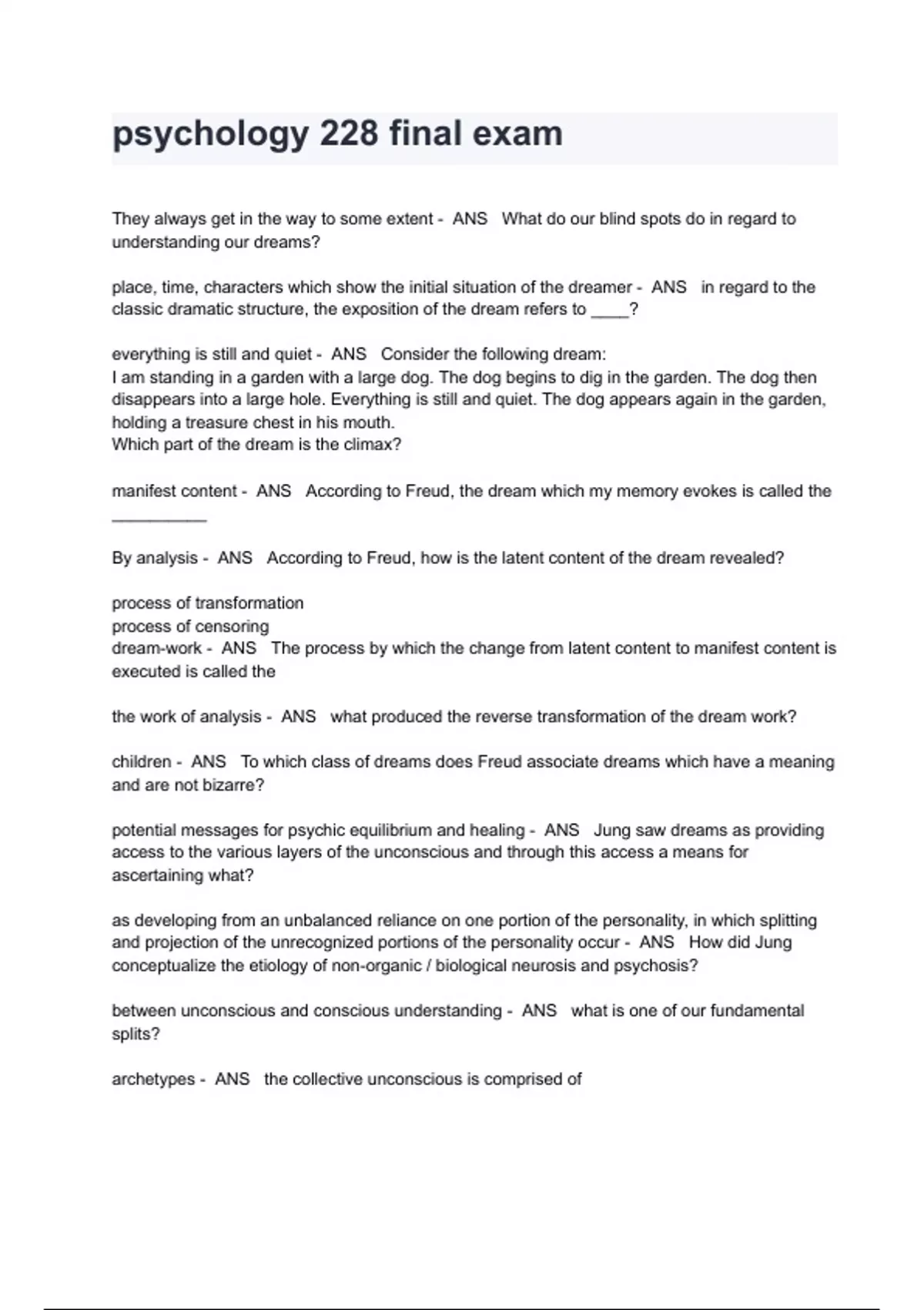 psychology 228 Final Exam Questions And Answers All Verified By An Expert They always get in the way to some extent - ANS What do our blind spots do in regard to understanding our dreams? place, time, characters which show the initial situation of the dreamer - ANS in regard to the classic dramatic structure, the exposition of the dream refers to ____? everything is still and quiet - ANS Consider the following dream: I am standing in a garden with a large dog. The dog begins to dig in the garden. The dog then disappears into a large hole. Everything is still and quiet. The dog appears again in the garden, holding a treasure chest in his mouth. Which part of the dream is the climax? manifest content - ANS According to Freud, the dream which my memory evokes is called the __________ By analysis - ANS According to Freud, how is the latent content of the dream revealed? process of transformation process of censoring dream-work - ANS The process by which the change from latent content to manifest content is executed is called the the work of analysis - ANS what produced the reverse transformation of the dream work? children - ANS To which class of dreams does Freud associate dreams which have a meaning and are not bizarre? potential messages for psychic equilibrium and healing - ANS Jung saw dreams as providing access to the various layers of the unconscious and through this access a means for ascertaining what? as developing from an unbalanced reliance on one portion of the personality, in which splitting and projection of the unrecognized portions of the personality occur - ANS How did Jung conceptualize the etiology of non-organic / biological neurosis and psychosis? between unconscious and conscious understanding - ANS what is one of our fundamental splits? archetypes - ANS the collective unconscious is comprised of something that the ego does not know and does not understand - ANS what, invariably, are dreams seeking to express? The unconscious exits to enlarge consciousness, and ... it does its work by symbolic suggestion. - ANS according to john beebe, what is the foundational idea of the jungian dream work?