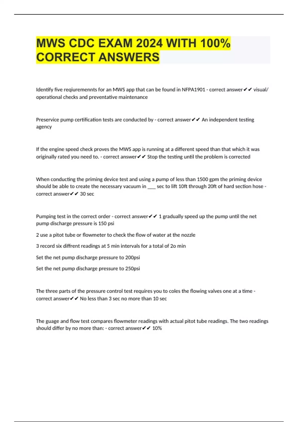 MWS CDC EXAM 2024 WITH 100% CORRECT ANSWERS Identify five reqiuremennts for an MWS app that can be found in NFPA1901 - correct answer visual/ operational checks and preventative maintenance Preservice pump certification tests are conducted by - correct answer An independent testing agency If the engine speed check proves the MWS app is running at a different speed than that which it was originally rated you need to. - correct answer Stop the testing until the problem is corrected When conducting the priming device test and using a pump of less than 1500 gpm the priming device should be able to create the necessary vacuum in ___ sec to lift 10ft through 20ft of hard section hose - correct answer 30 sec Pumping test in the correct order - correct answer 1 gradually speed up the pump until the net pump discharge pressure is 150 psi 2 use a pitot tube or flowmeter to check the flow of water at the nozzle 3 record six diffrent readings at 5 min intervals for a total of 2o min Set the