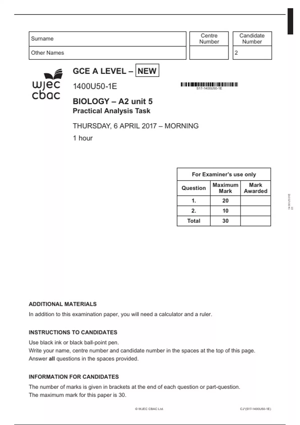 GCE A LEVEL – NEW 1400U50-1E BIOLOGY – A2 unit 5 Practical Analysis Task