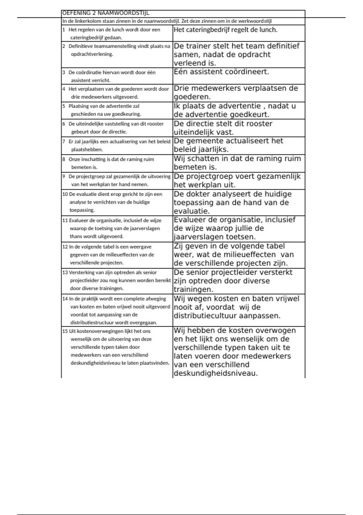 In de linkerkolom staan zinnen in de naamwoordstijl. Zet deze zinnen om in de werkwoordstijl