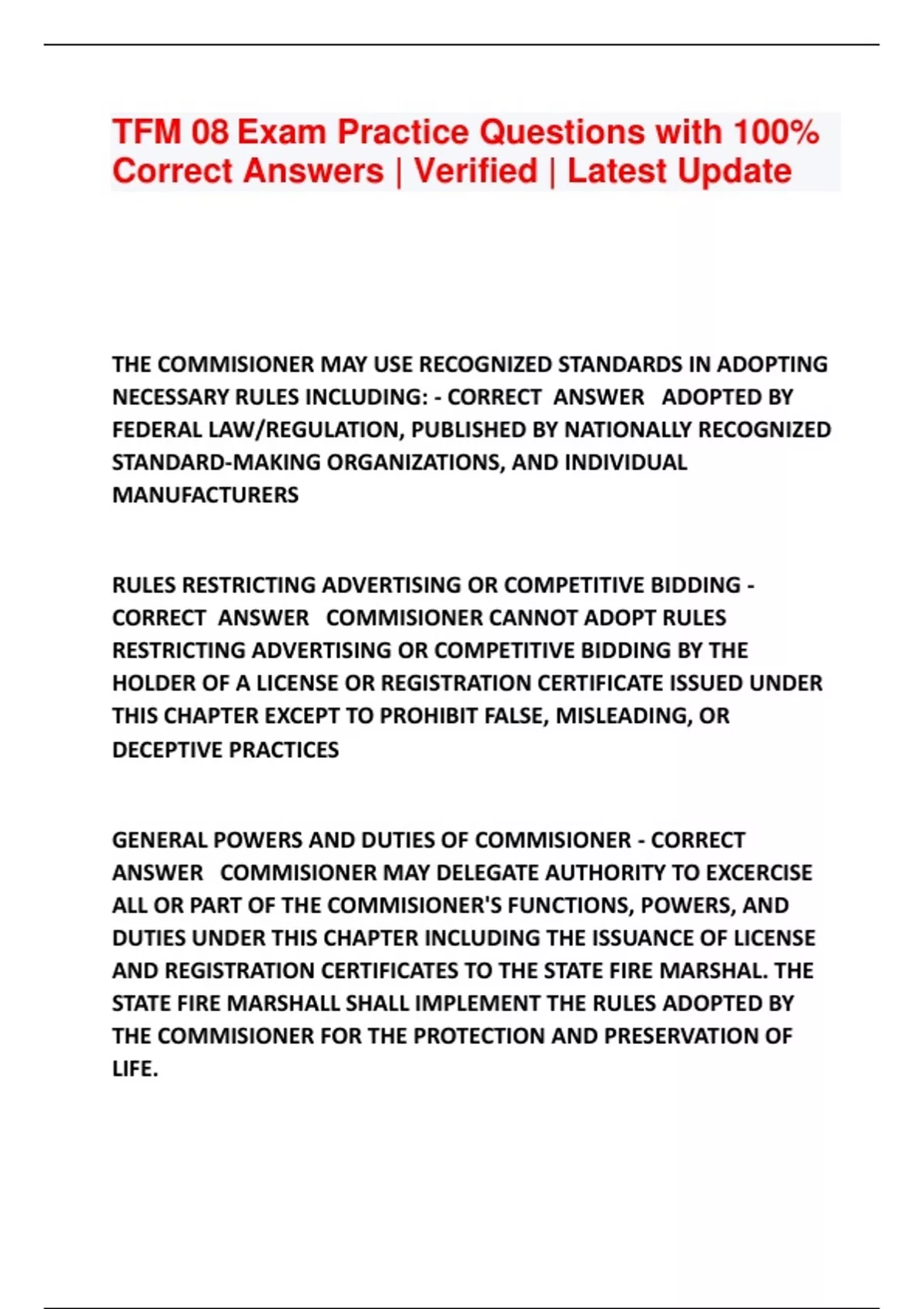 TFM 08 Exam Practice Questions with 100% Correct Answers | Verified | Latest Update THE COMMISIONER MAY USE RECOGNIZED STANDARDS IN ADOPTING NECESSARY RULES INCLUDING: - CORRECT ANSWER ADOPTED BY FEDERAL LAW/REGULATION, PUBLISHED BY NATIONALLY RECOGNIZED STANDARD-MAKING ORGANIZATIONS, AND INDIVIDUAL MANUFACTURERS RULES RESTRICTING ADVERTISING OR COMPETITIVE BIDDING - CORRECT ANSWER COMMISIONER CANNOT ADOPT RULES RESTRICTING ADVERTISING OR COMPETITIVE BIDDING BY THE HOLDER OF A LICENSE OR REGISTRATION CERTIFICATE ISSUED UNDER THIS CHAPTER EXCEPT TO PROHIBIT FALSE, MISLEADING, OR DECEPTIVE PRACTICES GENERAL POWERS AND DUTIES OF COMMISIONER - CORRECT ANSWER COMMISIONER MAY DELEGATE AUTHORITY TO EXCERCISE ALL OR PART OF THE COMMISIONER'S FUNCTIONS, POWERS, AND DUTIES UNDER THIS CHAPTER INCLUDING THE ISSUANCE OF LICENSE AND REGISTRATION CERTIFICATES TO THE STATE FIRE MARSHAL. THE STATE FIRE MARSHA