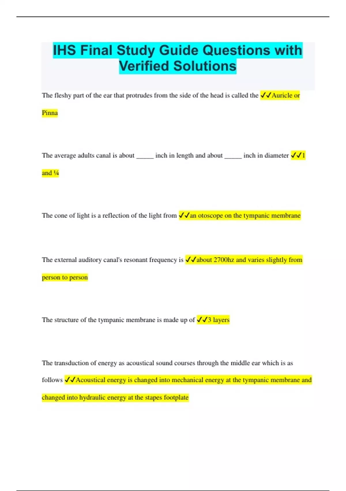 IHS Final Study Guide Questions with Verified Solutions The fleshy part of the ear that protrudes from the side of the head is called the Auricle or Pinna The average adults canal is about _____ inch in length and about _____ inch in diameter 1 and 1⁄4 The cone of light is a reflection of the light from an otoscope on the tympanic membrane The external auditory canal's resonant frequency is about 2700hz and varies slightly from person to person The structure of the tympanic membrane is made up of 3 layers The transduction of energy as acoustical sound courses through the middle ear which is as follows Acoustical energy is changed into mechanical energy at the tympanic membrane and changed into hydraulic energy at the stapes footplate The promontory is located on the medial wall of the middle ear It represents the basal turn of the cochlea Otitis media is an ear infection that may result from Eustachian tube dysfunction Fluid in the middle ear is also called effusion Otosclerosis immobilizes the ossicles at the stapes footplate The cochlea in located with the petrous portion of the temporal bone. It coils in about 2 1⁄2 turns. Uncoiled it measures about 1 inch Three chambers within the inner ear are called scala vestibuli, scala media, scala tympani The basilar membrane and the reissner's membrane separate the cochlea into three chambers. The organ of Corti is the sensory receptor for hearing The hair cells activate the auditory nerve through electrochemical energy The Place Theory of Hearing is simply explained as the basal turn of the cochlea responds to high frequencies and the apical turn of the cochlea responds to low The singular perception of two different signals presented to each ear simultaneously is binaural fusion An octave is the doubling of a frequency