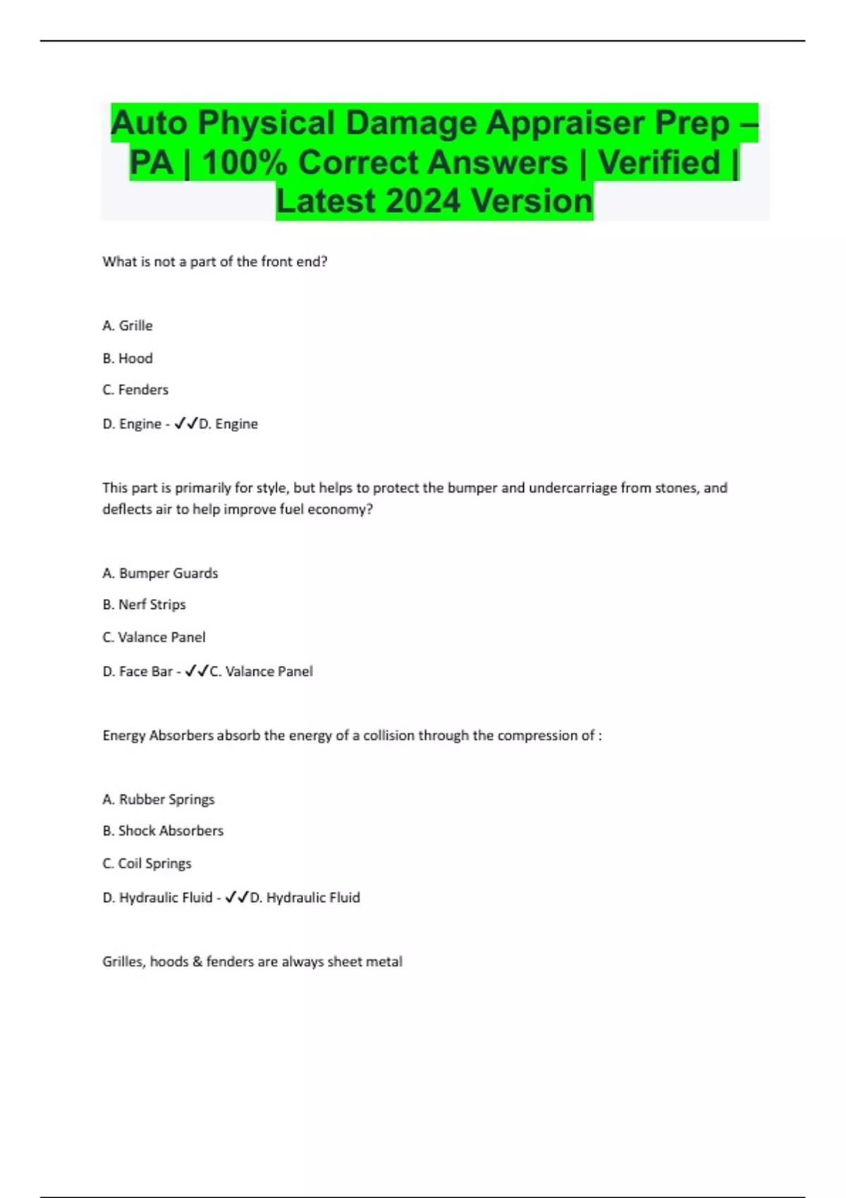 Auto Physical Damage Appraiser Prep – PA | 100% Correct Answers | Verified | Latest 2024 Version