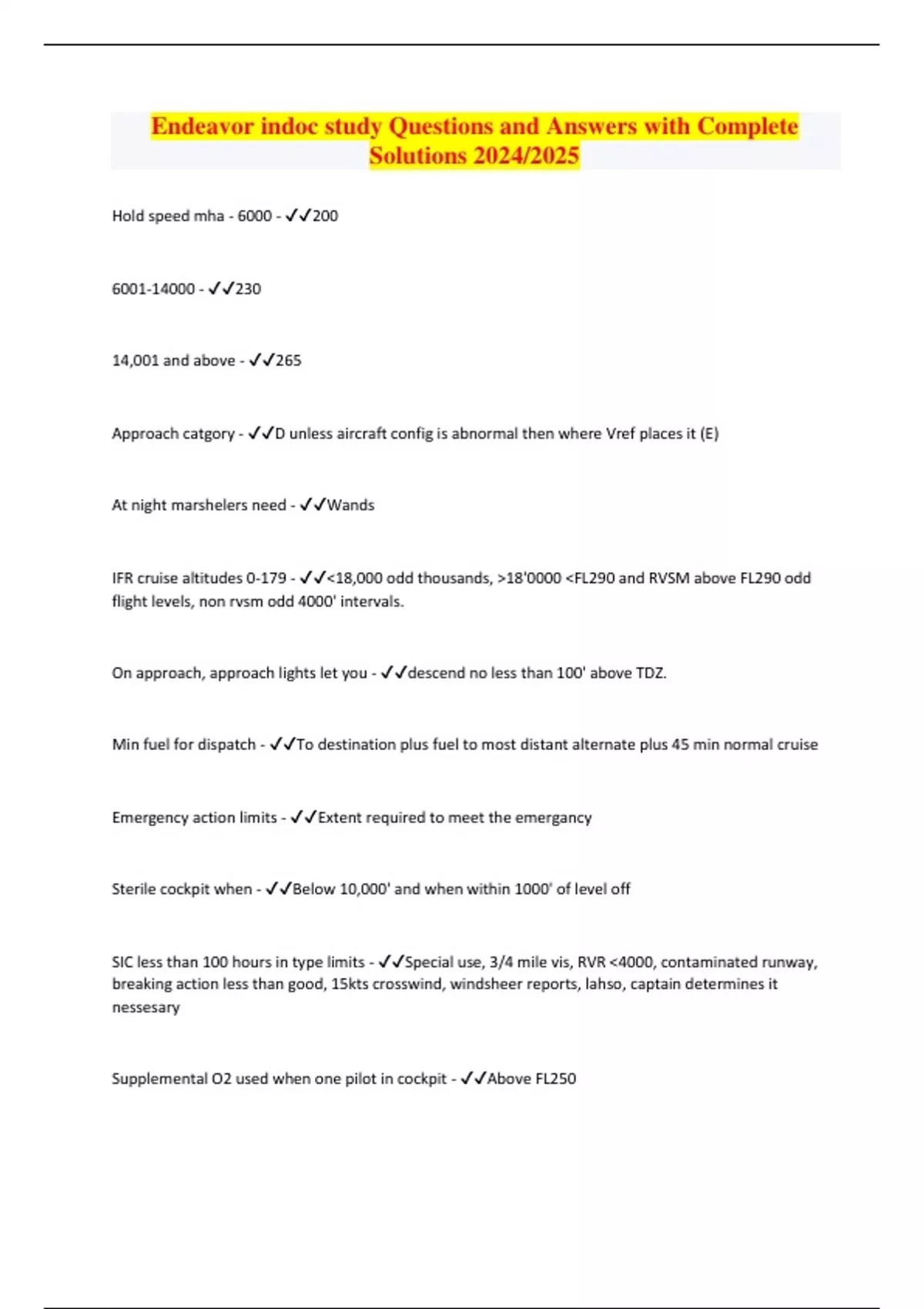 Hold speed mha - 6000 - 200 - 230 14,001 and above - 265 Approach catgory - D unless aircraft config is abnormal then where Vref places it (E) At night marshelers need - Wands IFR cruise altitudes 0-179 - <18,000 odd thousands, >18'0000 <FL290 and RVSM above FL290 odd flight levels, non rvsm odd 4000' intervals. On approach, approach lights let you - descend no less than 100' above TDZ. Min fuel for dispatch - To destination plus fuel to most distant alternate plus 45 min normal cruise Emergency action limits - Extent required to meet the emergancy Sterile cockpit when - Below 10,000' and when within 1000' of level off SIC less than 100 hours in type limits - Special use, 3/4 mile vis, RVR <4000, contaminated runway, breaking action less than good, 15kts crosswind, windsheer reports, lahso, captain determines it nessesary
