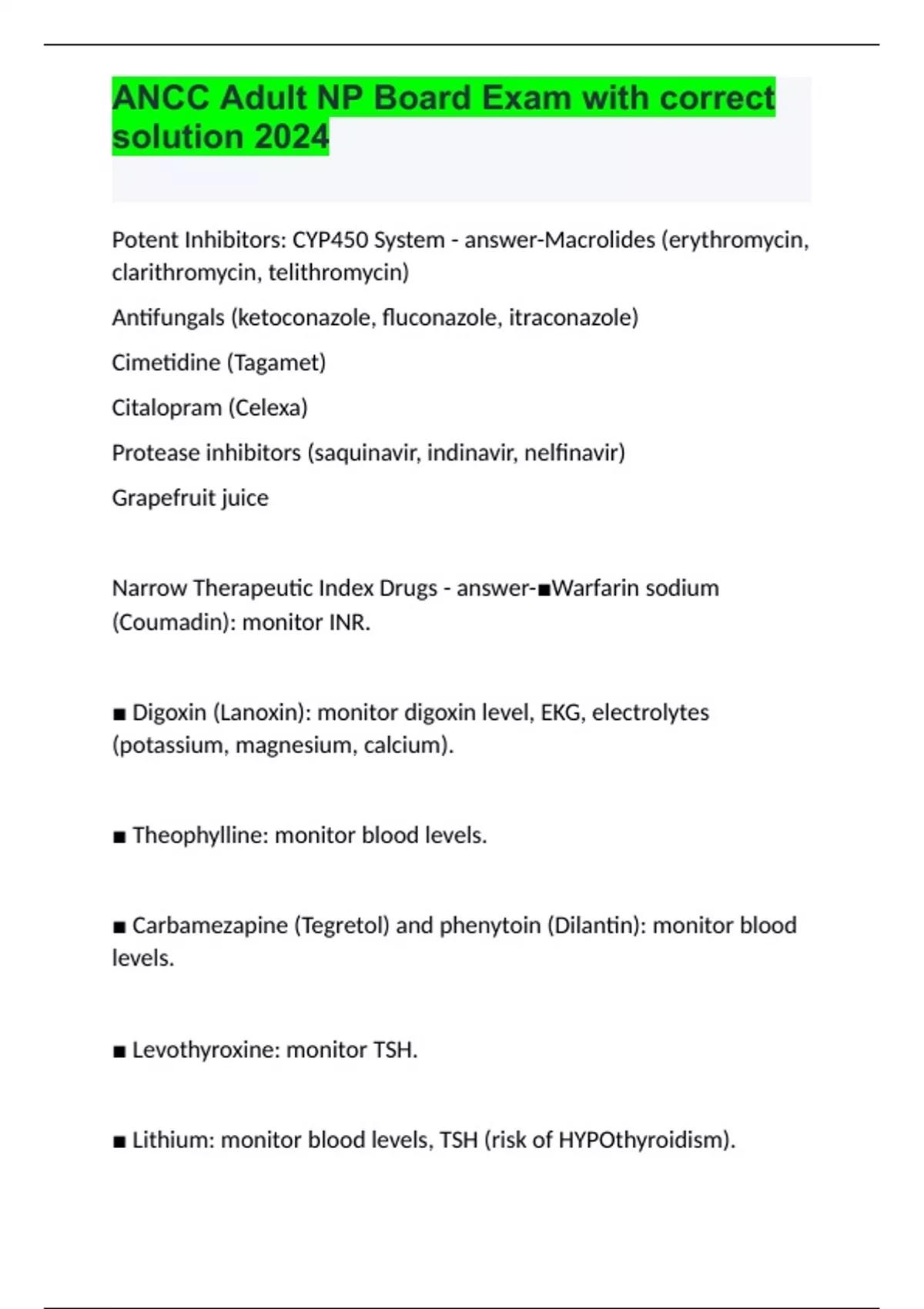Potent Inhibitors: CYP450 System - answer-Macrolides (erythromycin, clarithromycin, telithromycin) Antifungals (ketoconazole, fluconazole, itraconazole) Cimetidine (Tagamet) Citalopram (Celexa) Protease inhibitors (saquinavir, indinavir, nelfinavir) Grapefruit juice Narrow Therapeutic Index Drugs - answer-■Warfarin sodium (Coumadin): monitor INR. ■ Digoxin (Lanoxin): monitor digoxin level, EKG, electrolytes (potassium, magnesium, calcium). ■ Theophylline: monitor blood levels. ■ Carbamezapine (Tegretol) and phenytoin (Dilantin): monitor blood levels. ■ Levothyroxine: monitor TSH. ■ Lithium: monitor blood levels, TSH (risk of HYPOthyroidism). Beers Criteria - answer-Antipsychotics: Quetiapine, clozapine, and pimavanserin may be used with caution. Rivaroxaban and dabigatran: Higher bleeding risk than warfarin and other direct oral anticoagulants. Tramadol: Risk of hyponatremia from syndrome of inappropriate antidiuretic hormone secretion. Opioids: Do not combine with benzodiazepines or gabapentinoids, as they increase the risk of severe respiratory depression. s/sx of digoxin toxicity - answer-Initial symptoms are GI (nausea/vomiting), hyperkalemia, and bradydysrhythmias (atrioventricular [AV] blocks) or tachydysrhythmias (ventricular tachycardia/fibrillation or atrial tachycardia with 2:1 block). Others include confusion and visual changes (yellowish-green-tinged color vision). Digoxin therapeutic range - answer-0.5-2 mg Warfarin INR range issues - answer-Consistently Stable INR Check every 2 to 4 weeks up to every 12 weeks. Single Out-of-Range INR If patient has stable INR and has a single out-of-range INR ≤0.5 below or above therapeutic INR (2-3), experts suggest continuing current warfarin dose; retest INR within 1 to 2 weeks. INR <5 With No Significant Bleeding Risk Omit one dose and/or reduce maintenance dose slightly; recheck INR. DOACs: Antidotes - answer-idarucizumab and andexanet alfa: reverse the anticoagulant effects of dabigatran and FXa inhibitors, respectively. Fresh frozen plasma and prothrombin complex concentrate can also be used for rapid reversa 2017 ACC/AHA stages of hypertension - answer-Normal BP: Systolic <120 mmHg and diastolic <80 mmHg Elevated BP: Systolic 120 to 129 mmHg and diastolic <80 mmHg Stage 1: Systolic 130 to 139 mmHg or diastolic 80 to 89 mmHg Stage 2: Systolic ≥140 mmHg or diastolic ≥90 mmHg Thiazide diuretics contraindication - answer-Sulfa allergy (Caution with gout, diabetes) Also loop diuretics contraindicated with sulfa allergy Patients with both ____, and ______ receive an extra benefit from thiazides. - answer-hypertension, osteoporosis Potassium sparing diuretics black box warning - answer-Hyperkalemia, which can be fatal; higher risk with renal impairment, diabetes, elderly, severely ill With severe__________ disease, all ACEIs, ARBs, and aliskiren are contraindicated because of high risk of hyperkalemia. - answer-renal /CKD Loop Diuretics Adverse Effects - answer-Electrolytes (hypokalemia, hyponatremia, hypomagnesemia, and low levels of chlorine) Hypovolemia and hypotension (dizziness, lightheadedness) Pancreatitis, jaundice, and rash Ototoxicity (worsens aminoglycoside ototoxicity effect if combined) cardioselective beta blockers - answer-metoprolol, atenolol Non-cardioselective beta blockers - answer-Propanolol, cardivalol -Blocks both beta 1 + beta 2 receptors (in lungs) -Don't give to person w/ resp illness including asthma, emphysema, chronic bronchitis -If block beta 2 receptors → causes bronchoconstriction, increased airway resistance → creates bigger problem than already have if resp problem Beta blockers will blunt the _________ effect, warn diabetics. - answer-Hypoglycemic Alpha blockers - answer-Terazosin (Hytrin): Can lower BP and treat BPH Doxazosin (Cardura): Can lower BP and treat BPH Tamsulosin (Flomax): For BPH treatment Alfuzosin (Uroxatral): For BPH treatment Silodosin (Rapaflo): For BPH treatment Prazosin (Minipress): Alpha-blocker for hypertension but not for BPH; off-label use for PTSD-related nightmares/sleep dysfunction Hypertension in pregnancy - answer-"Hypertensive Moms Love Nifedipine" Hydralazine Methyldopa Labetalol Nifedipine Tetracyclines Indications - answer-eg: Doxycycline, minocycline. Acne, chronic bronchitis, Lyme disease, Rocky Mountain spotted fever, "walking" pneumonia, prophylaxis for traveler's diarrhea Macrolides - answer-erythromycin, clarithromycin, azithromycin **pregnancy safe **many drug interactions (less with azithromycin) Macrolide indications - answer-gram-positive cocci (except enterococci), staph aureus MSSA, Streptococcus pyogenes, and atypical bacteria (e.g., mycoplasma, chlamydia) --first line for: Pneumonia, chlamydia Tetracycline adverse effects - answer-Yellow/brown discoloration of teeth, hepatotoxicity, photosensitivity, photosensitivity, suprainfection/superinfection First generation cephalosporins - answer-Activity against gram-positive cocci bacteria (e.g., group A streptococcus/Streptococcus pyogenes, S. aureusMSSA, S. pneumoniae) Not effective against beta-lactamase-producing strains and MRSA Poor anaerobic coverage; risk of cross-reactivity if allergic to penicillin Cefazolin Cephalexin Cefadroxil Second generation cephalosporins - answer-Considered as "broad spectrum" antibiotics. Used to treat infections caused by gram positive bacteria . (sinusitis, otitis media) Cefuroxime axetil(Ceftin) PO BID ENT:Sinusitis, OM Cefprozil(Cefzil) PO BID Resp: CAP, exac chronic Bronchitis Cefaclor (Ceclor) PO BID others: AOM, sinusitis, skin infections Third Generation Cephalosporins - answer-Less activity against gram positive infections compared to the first generation cephalosporins. Better covereage for gram negative bacteria(Neisseria gonorrheae infections) and against enteric bacteria 3rd gen Ceph Ceftriaxone (Rocephine)IM STD:Gonorrhea cervicitis, urethritis, PID Cefixime (Suprax) daily to BID ENT: AOM in children, acute sinusitis, OM Cefdinir(Omnicef) daily t