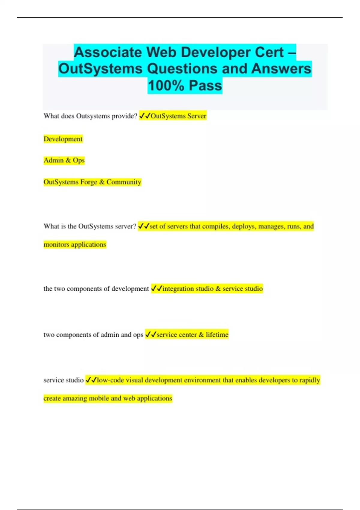 Associate Web Developer Cert – OutSystems Questions and Answers 100% Pass What does Outsystems provide? OutSystems Server Development Admin & Ops OutSystems Forge & Community What is the OutSystems server? set of servers that compiles, deploys, manages, runs, and monitors applications the two components of development integration studio & service studio two components of admin and ops service center & lifetime service studio low-code visual development environment that enables developers to rapidly create amazing mobile and web applications integration studio dev environment for integrating external resources; integrate existing data and code as well as create .NET code extensions service center platform server management console; admin console that is accessible via browser; access to platform server configuration for admin and operations teams lifetime web app that manages lifecycle across environments; extends service center's capabilities to cross environment scenarios; complete application lifecycle management via browser outsystems forge source of downloadable components to help speed app delivery what are screen actions bound to? widgets on a screen where can server actions be called? in any flow how many input and output parameters and local variables can server actions have? multiple do screen actions have output parameters no do preparations have parameters or variables no server actions that are set as a function are... 1. restricted to one output parameter 2. available in expressions what is an action flow where a piece of logic is defined actions flows can have one of what and multiple of what one start node multiple end nodes and raise exceptions what can screen actions and preparations also end with (2 things) besides end and raise exception? destination nodes and