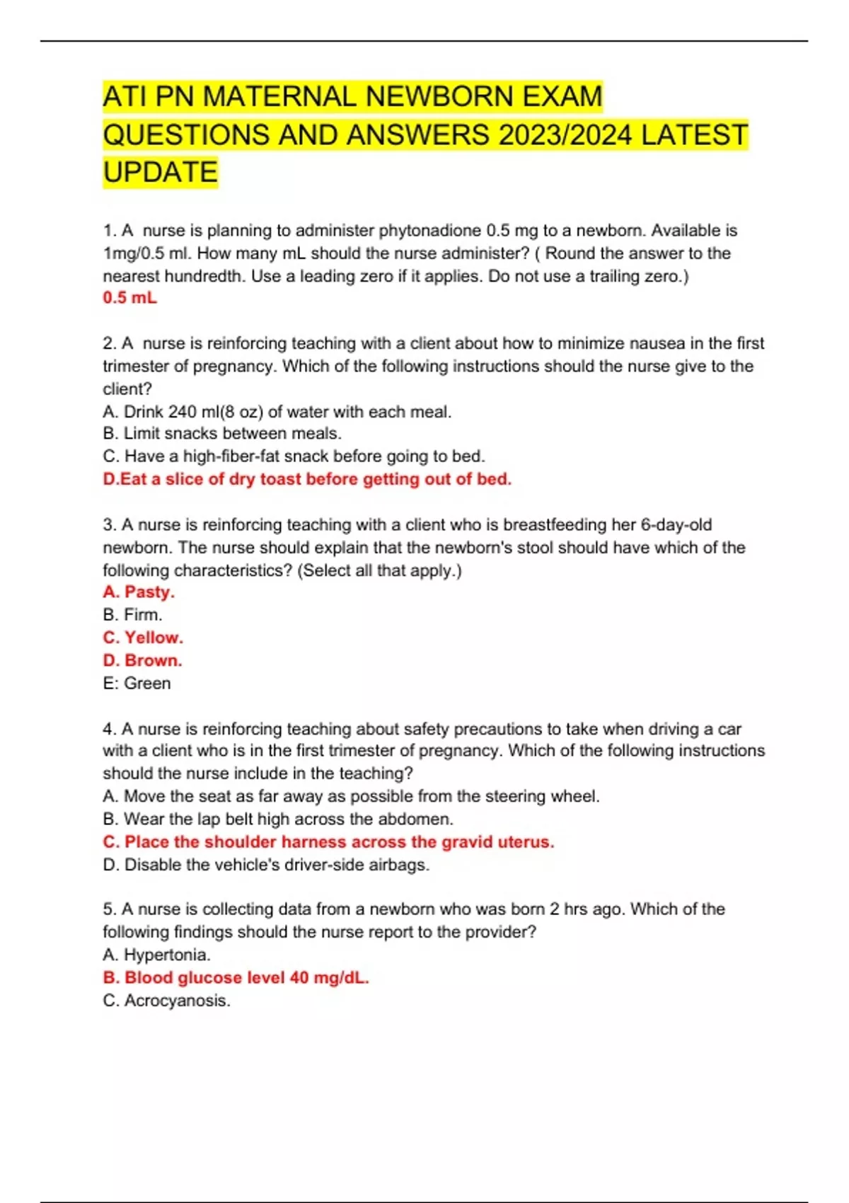 . A nurse is planning to administer phytonadione 0.5 mg to a newborn. Available is 1mg/0.5 ml. How many mL should the nurse administer? ( Round the answer to the nearest hundredth. Use a leading zero if it applies. Do not use a trailing zero.) 0.5 mL 2. A nurse is reinforcing teaching with a client about how to minimize nausea in the first trimester of pregnancy. Which of the following instructions should the nurse give to the client? A. Drink 240 ml(8 oz) of water with each meal. B. Limit snacks between meals. C. Have a high-fiber-fat snack before going to bed. D.Eat a slice of dry toast before getting out of bed. 3. A nurse is reinforcing teaching with a client who is breastfeeding her 6-day-old newborn. The nurse should explain that the newborn's stool should have which of the following characteristics? (Select all that apply.) A. Pasty. B. Firm. C. Yellow. D. Brown. E: Green 4. A nurse is reinforcing teaching about safety precautions to take when driving a car with a client who is in the first trimester of pregnancy. Which of the following instructions should the nurse include in the teaching? A. Move the seat as far away as possible from the steering wheel. B. Wear the lap belt high across the abdomen. C. Place the shoulder harness across the gravid uterus. D. Disable the vehicle's driver-side airbags. 5. A nurse is collecting data from a newborn who was born 2 hrs ago. Which of the following findings should the nurse report to the provider? A. Hypertonia. B. Blood glucose level 40 mg/dL. C. Acrocyanosis. D. Overlapping suture lines. 6. A nurse is reinforcing teaching with a client who is at 39 weeks of gestation and is scheduled for non-stress test. The nurse should instruct the client to press the handheld button for which of the following occurrences? Ans: When she feels fetal movement. 7. A nurse is assisting with a prenatal class discussion about newborn safety. Which of the following statements by a participant indicates an understanding of the teaching? A. I should set my hot water heater to 130 degree F B. I should replace the batteries in my smoke detector twice per year. C. I should use baby powder with each diaper change. D.I should elevate my baby head on a cushion when she is sleeping. 8. A nurse is reinforcing teaching with a client who is receiving nifedipine for preterm lab. Which of the following is an adverse effect of this medication? A.Thrombocytopenia. B.Hypertension. C. Polyuna. D. Dizziness. 13. A nurse is reinforcing teaching about risk for preeclampsia with a group of clients who are pregnant. Which of the following risk factors should the nurse include in the teaching? A. Chronic hypertension. B. Pre Pregnancy BMI of19. C. Third pregnancy. D. Maternal age of 30 years. 14. A nurse is collecting data from a newborn who is receiving phototherapy. Which of the following findings is an indication of dehydration? A. Bounding pulses. B. Decreased skin turgor. C. Decreased urine specific gravity. D. Bulging anterior fontanel. 15. A nurse is reInforcing teaching car seat safety with a parent of a newborn. Which of the following statements by the parent indicates an understanding of the teaching? A. "I will place the retainer clip at the level of my baby's armpits." B. I will place a thick, soft pad behind my baby's back." C. I can turn the car seat so it faces forward when my baby weighs 15 pounds." D. I should place my baby in the car seat at a 90 degree angle."