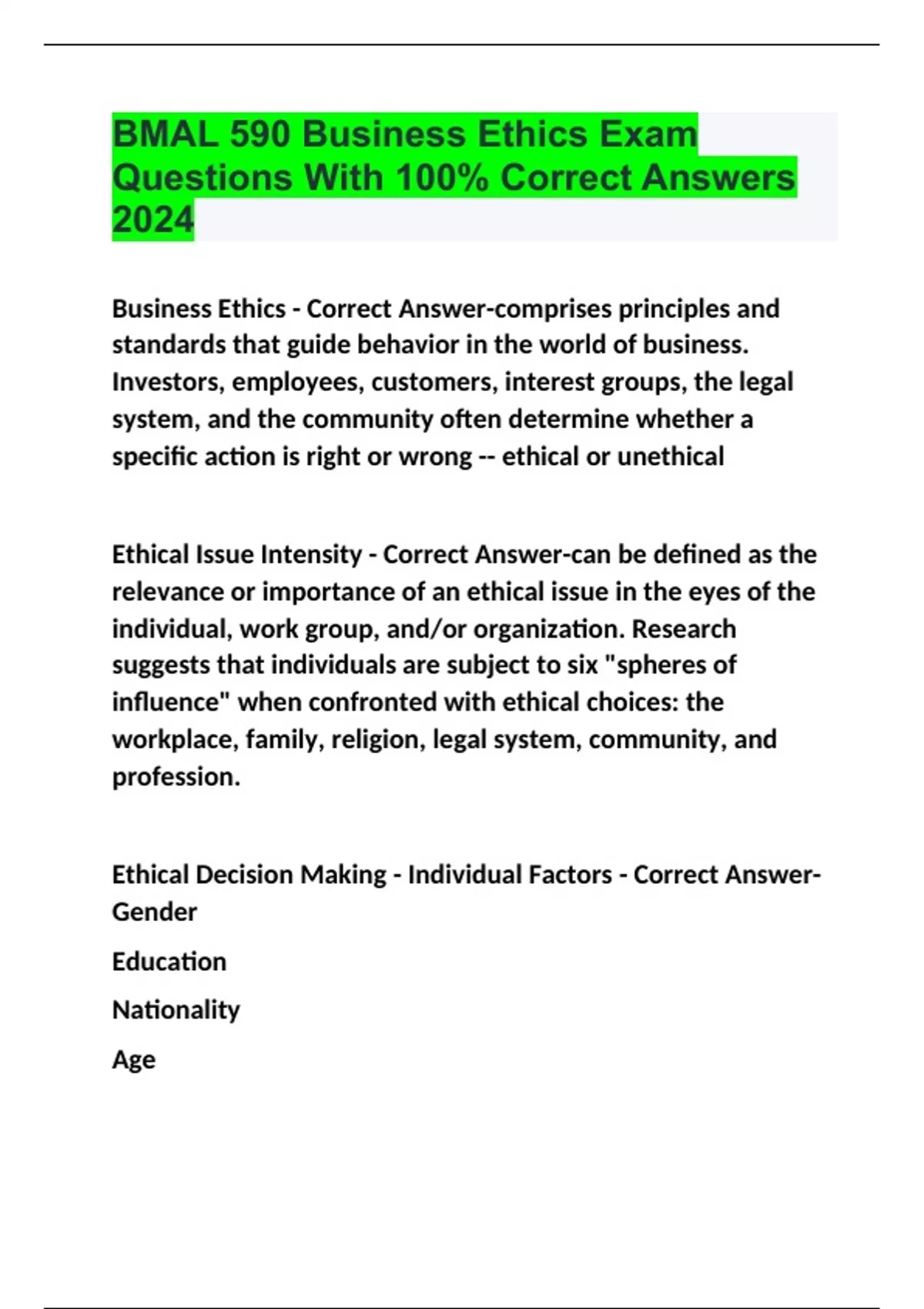 BMAL 590 Business Ethics Exam Questions With 100% Correct Answers 2024