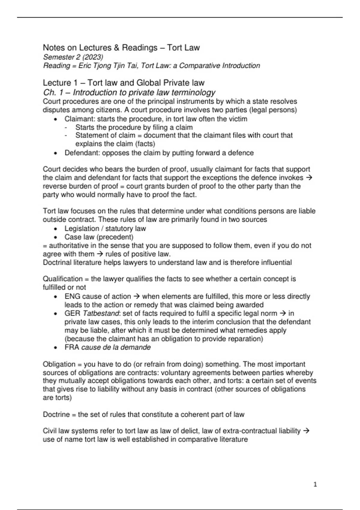 Lecture 1 – Tort law and Global Private law