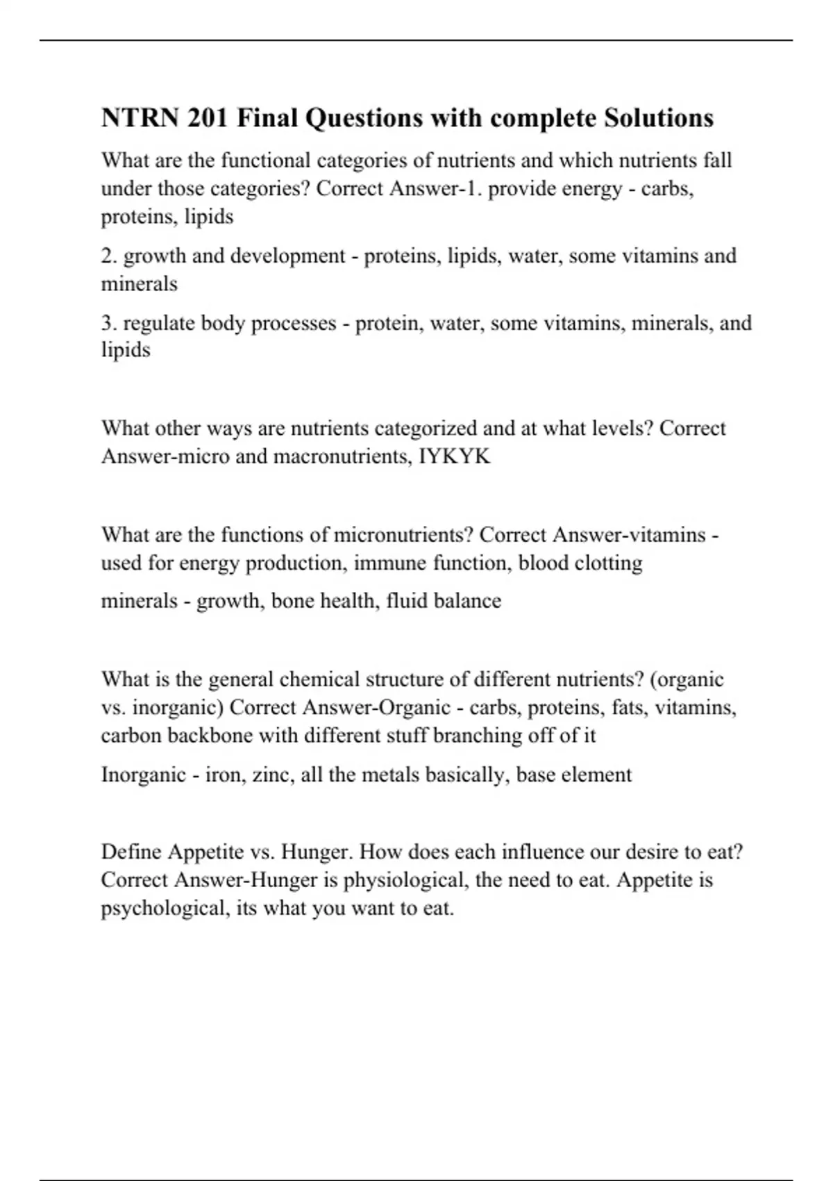 functional categories of nutrients Correct Answer-1. primarily provide energy 2. important for growth & development 3. replacing the nutrient restores function (includes macro & micronutrients) ways nutrients are categorized Correct Answer-energy yielding (carbs, lipids, protein) non energy yielding (water soluble vitamins, fat soluble vitamins, minerals, & trace minerals) functions of micronutrients Correct Answer-play a role in metabolism, typically as enzyme cofactors, needed in mg amounts general chemical structure of different nutrients? (organic vs. inorganic) Correct Answer-organic contain carbon structures while inorganic do not appetite Correct Answer-the psychological desire for food, environmental hunger Correct Answer-the natural physical drive to eat, prompted by the body's need for food
