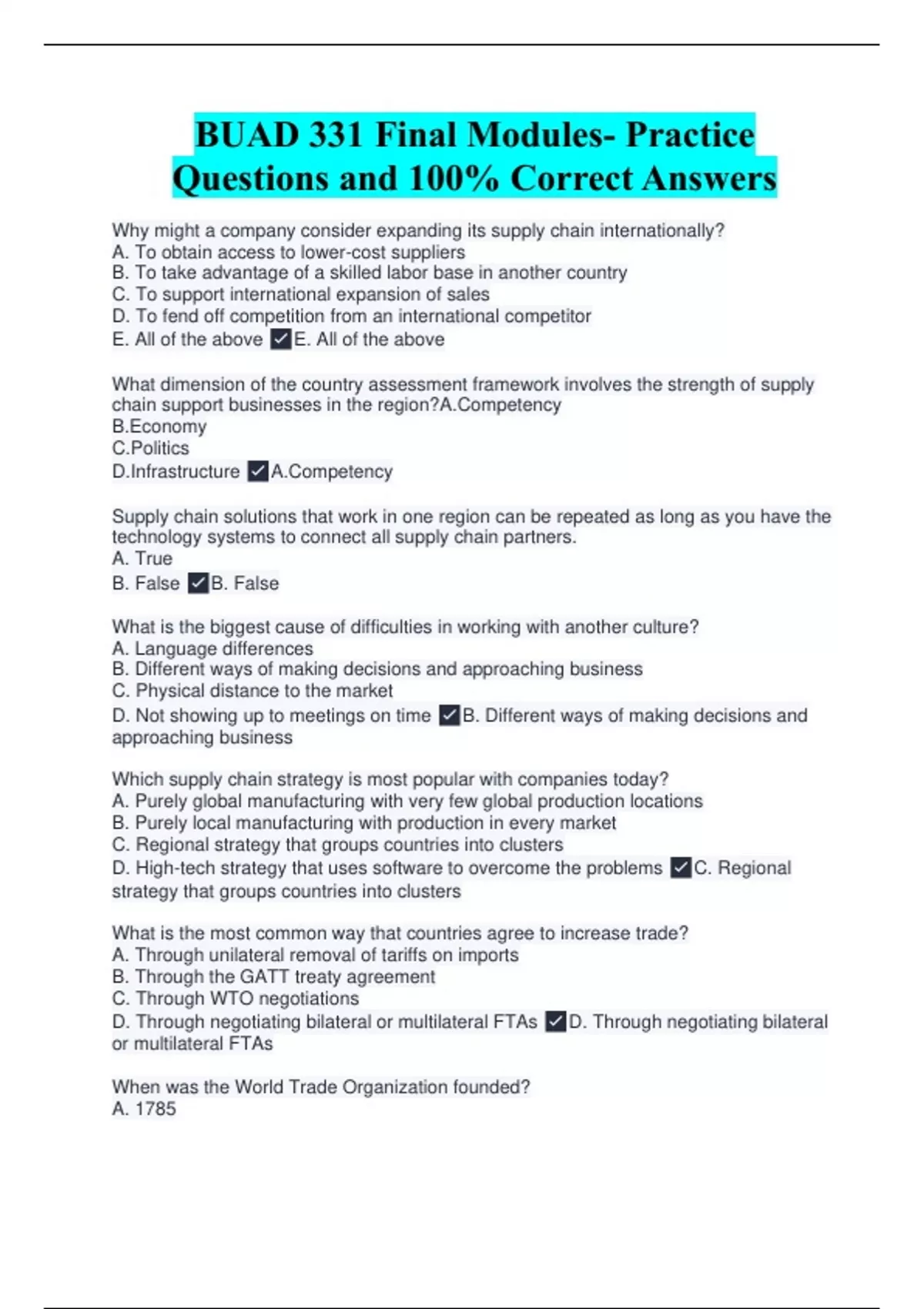 Why might a company consider expanding its supply chain internationally? A. To obtain access to lower-cost suppliers B. To take advantage of a skilled labor base in another country C. To support international expansion of sales D. To fend off competition from an international competitor E. All of the above E. All of the above What dimension of the country assessment framework involves the strength of supply chain support businesses in the region?A.Competency B.Economy C.Politics D.Infrastructure A.Competency Supply chain solutions that work in one region can be repeated as long as you have the technology systems to connect all supply chain partners. A. True B. False B. False What is the biggest cause of difficulties in working with another culture? A. Language differences B. Different ways of making decisions and approaching business C. Physical distance to the market D. Not showing up to meetings on time B. Different ways of making decisions and approaching business Which supply chain strategy is most popular with companies today? A. Purely global manufacturing with very few global production locations B. Purely local manufacturing with production in every market C. Regional strategy that groups countries into clusters D. High-tech strategy that uses software to overcome the problems C. Regional strategy that groups countries into clusters What is the most common way that countries agree to increase trade? A. Through unilateral removal of tariffs on imports B. Through the GATT treaty agreement C. Through WTO negotiations D. Through negotiating bilateral or multilateral FTAs D. Through negotiating bilateral or multilateral FTAs When was the World Trade Organization founded? A. 1785 B. 1895 C. 1905 D. 1995 D. 1995