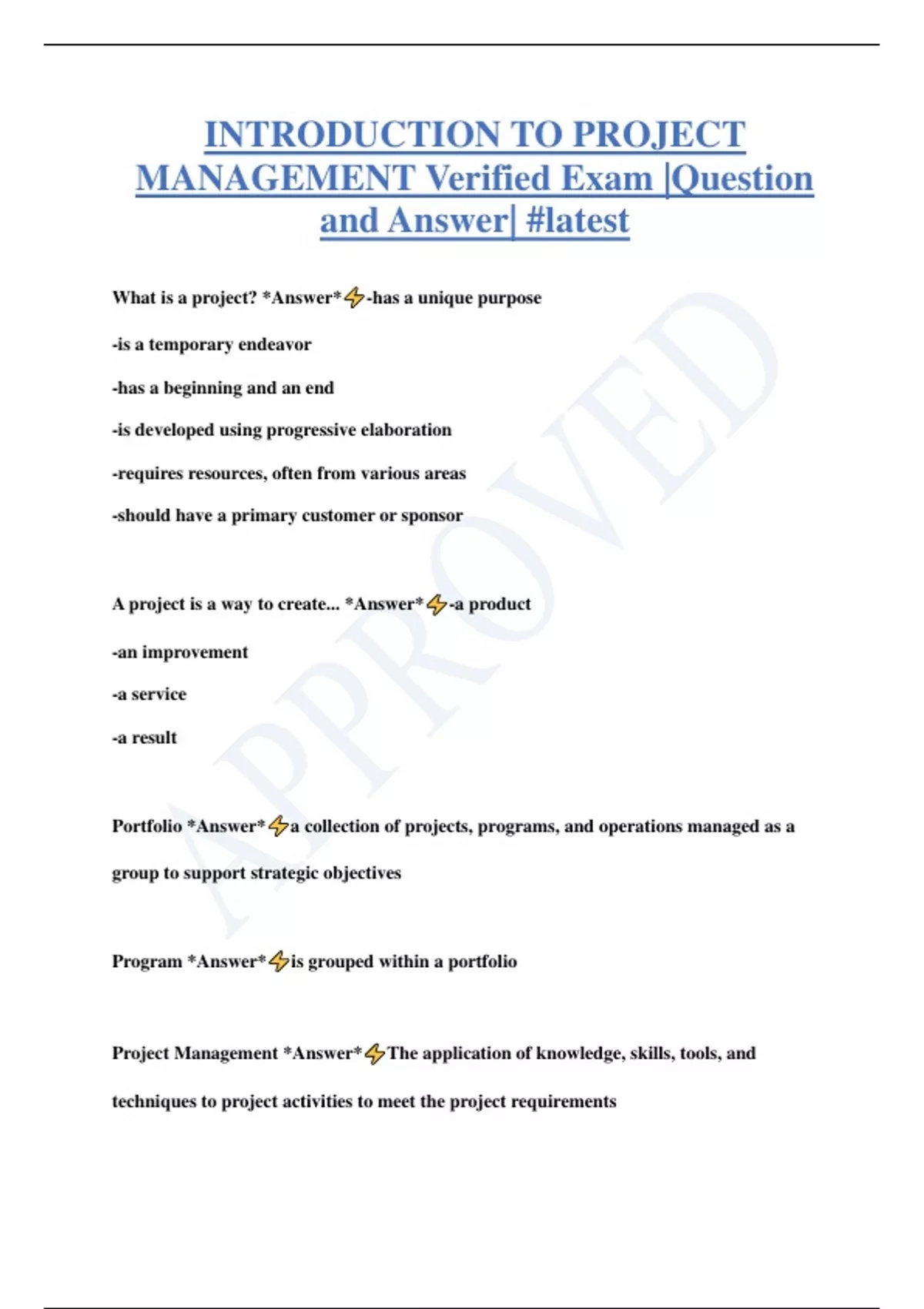 INTRODUCTION TO PROJECT MANAGEMENT Verified Exam |Question and Answer| #latest What is a project? *Answer* -has a unique purpose -is a temporary endeavor -has a beginning and an end -is developed using progressive elaboration -requires resources, often from various areas -should have a primary customer or sponsor A project is a way to create... *Answer* -a product -an improvement -a service -a result Portfolio *Answer* a collection of projects, programs, and operations managed as a group to support strategic objectives Program *Answer* is grouped within a portfolio Project Management *Answer* The application of knowledge, skills, tools, and techniques to project activities to meet the project requirements The 5 process groups (Project life cycle) *Answer* 1. Initiating 2. Planning 3. Executing 4. Monitoring and Controlling 5. Closing the knowledge area of Project Integration Management *Answer* Ensure that all the project's components are properly coordianted the knowledge area of Project Scope Management *Answer* Define the processes that limit and control the work included in a project the knowledge area of Project time Management *Answer* Manage the activities to complete the project w
