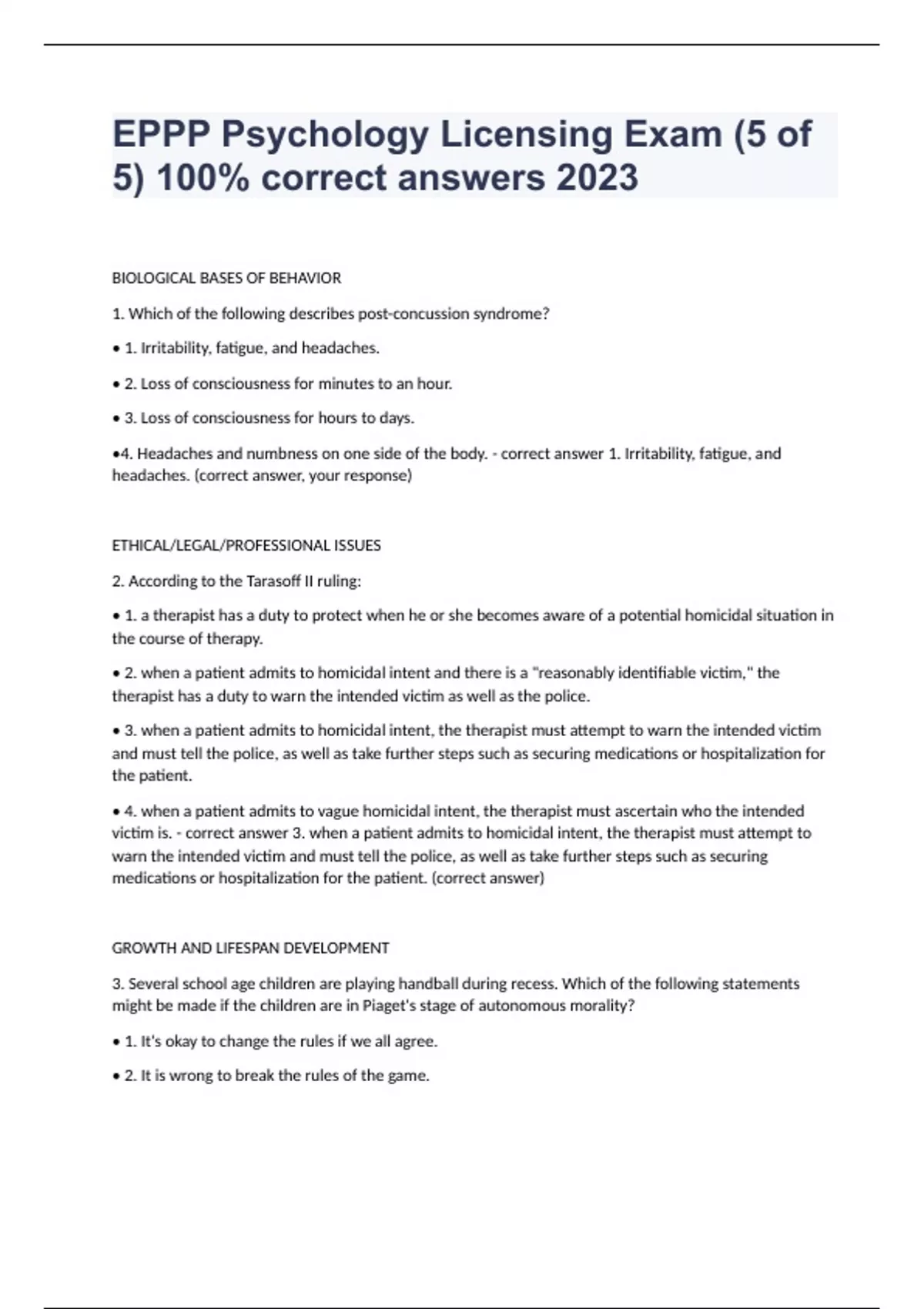 EPPP Psychology Licensing Exam (5 of 5) 100% correct answers 2023(updated) EPPP Psychology Licensing Exam (5 of 5) 100% correct answers 2023 BIOLOGICAL BASES OF BEHAVIOR 1. Which of the following describes post-concussion syndrome? • 1. Irritability, fatigue, and headaches. • 2. Loss of consciousness for minutes to an hour. • 3. Loss of consciousness for hours to days. •4. Headaches and numbness on one side of the body. - correct answer 1. Irritability, fatigue, and headaches. (correct answer, your response) ETHICAL/LEGAL/PROFESSIONAL ISSUES 2. According to the Tarasoff II ruling: • 1. a therapist has a duty to protect when he or she becomes aware of a potential homicidal situation in the course of therapy. • 2. when a patient admits to homicidal intent and there is a "reasonably identifiable victim," the therapist has a duty to warn the intended victim as well as the police. • 3. when a patient admits to homicidal intent, the therapist must attempt to warn the intended victim and must tell the police, as well as take further steps such as securing medications or hospitalization for the patient. • 4. when a patient admits to vague homicidal intent, the therapist must ascertain who the intended victim is. - correct answer 3. when a patient admits to homicidal intent, the therapist must attempt to warn the intended victim and must tell the police, as well as take further steps such as securing medications or hospitalization for the patient. (correct answer) GROWTH AND LIFESPAN DEVELOPMENT 3. Several school age children are playing handball during recess. Which of the following statements might be made if the children are in Piaget's stage of autonomous morality? • 1. It's okay to change the rules if we all agree. • 2. It is wrong to break the rules of t